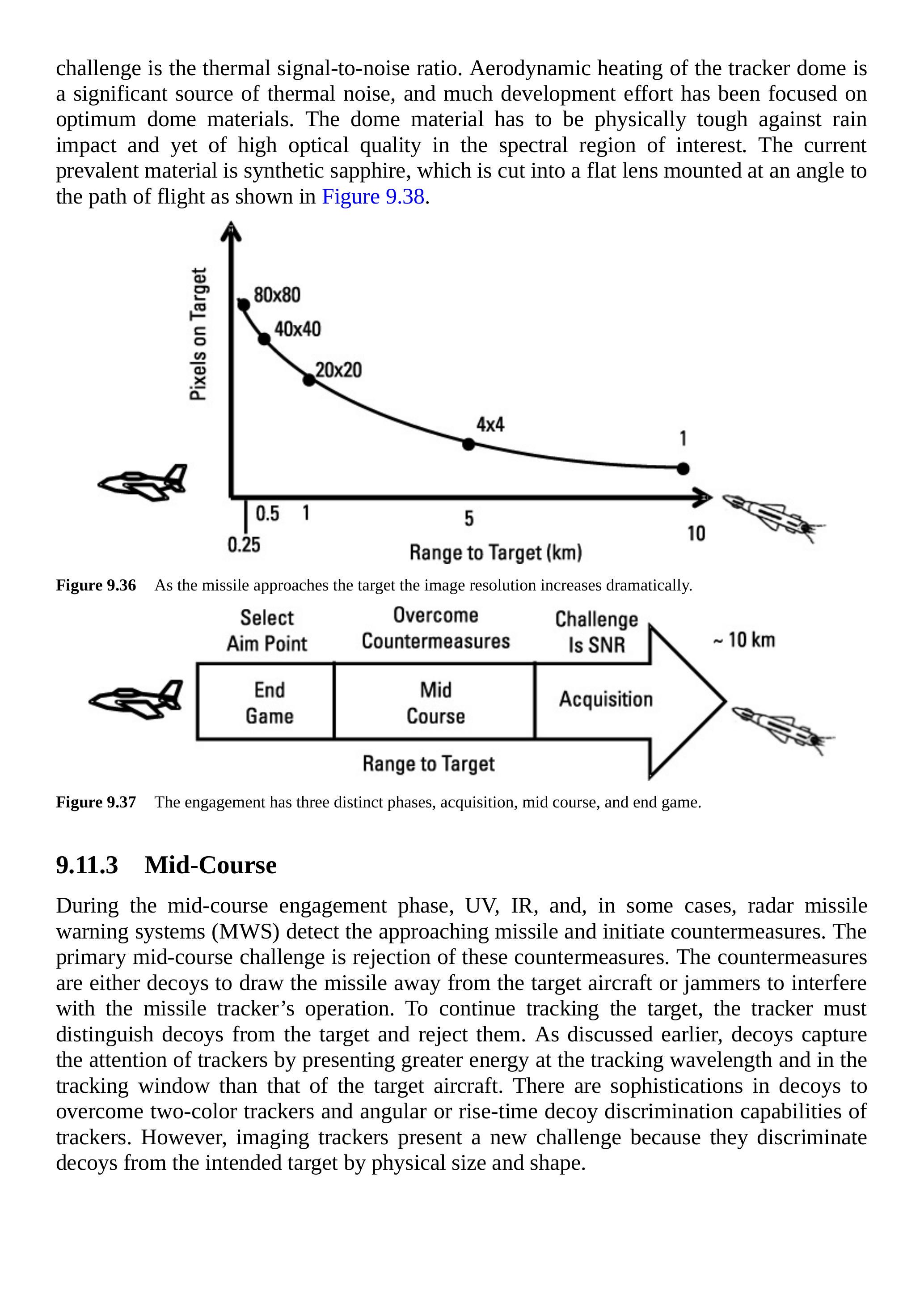 在目标获取阶段,目标在灰色背景下看起来像一个白点。主要挑战是热信号与噪声比(SNR)。跟踪器圆顶的气动加热是热噪声的重要来源,开发工作主要集中在优化圆顶材料上。圆顶材料必须既能抵御雨滴冲击,又在感兴趣的光谱区域具有高光学质量。目前常用材料是合成蓝宝石,将其切割成平板透镜,并如图 9.38 所示安装在飞行路径的角度上。