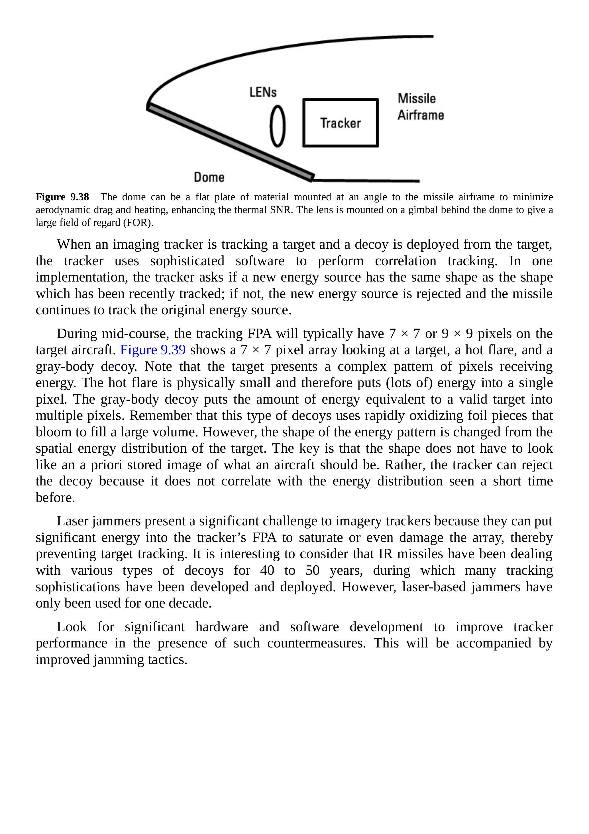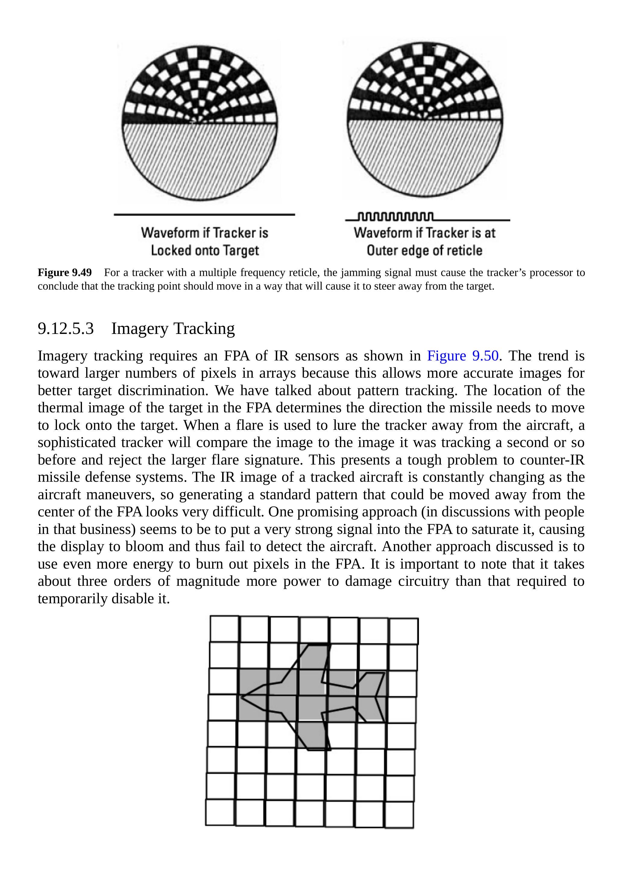 成像跟踪需要如图 9.50 所示的红外传感器焦平面阵列(FPA)。趋势是使用更多像素的阵列,因为这可以生成更精确的图像,从而提高目标辨识能力。我们已经讨论了模式跟踪。FPA 中目标热像的位置决定了导弹需要移动的方向以锁定目标。当使用热焰诱使跟踪器偏离飞机时,先进的跟踪器会将当前图像与一秒前跟踪的图像进行比较,并拒绝较大的热焰特征。这对抗红外导弹防御系统提出了严峻挑战。被跟踪飞机的红外图像随着飞机机动不断变化,因此生成可偏离 FPA 中心的标准模式非常困难。一种有前景的方法(根据业内人士讨论)是向 FPA 输入非常强的信号以使其饱和,从而使显示发散并无法检测到飞机。另一种方法是使用更多能量烧毁 FPA 像素。需要注意的是,破坏电路所需的功率大约是暂时失效所需功率的三倍数量级。