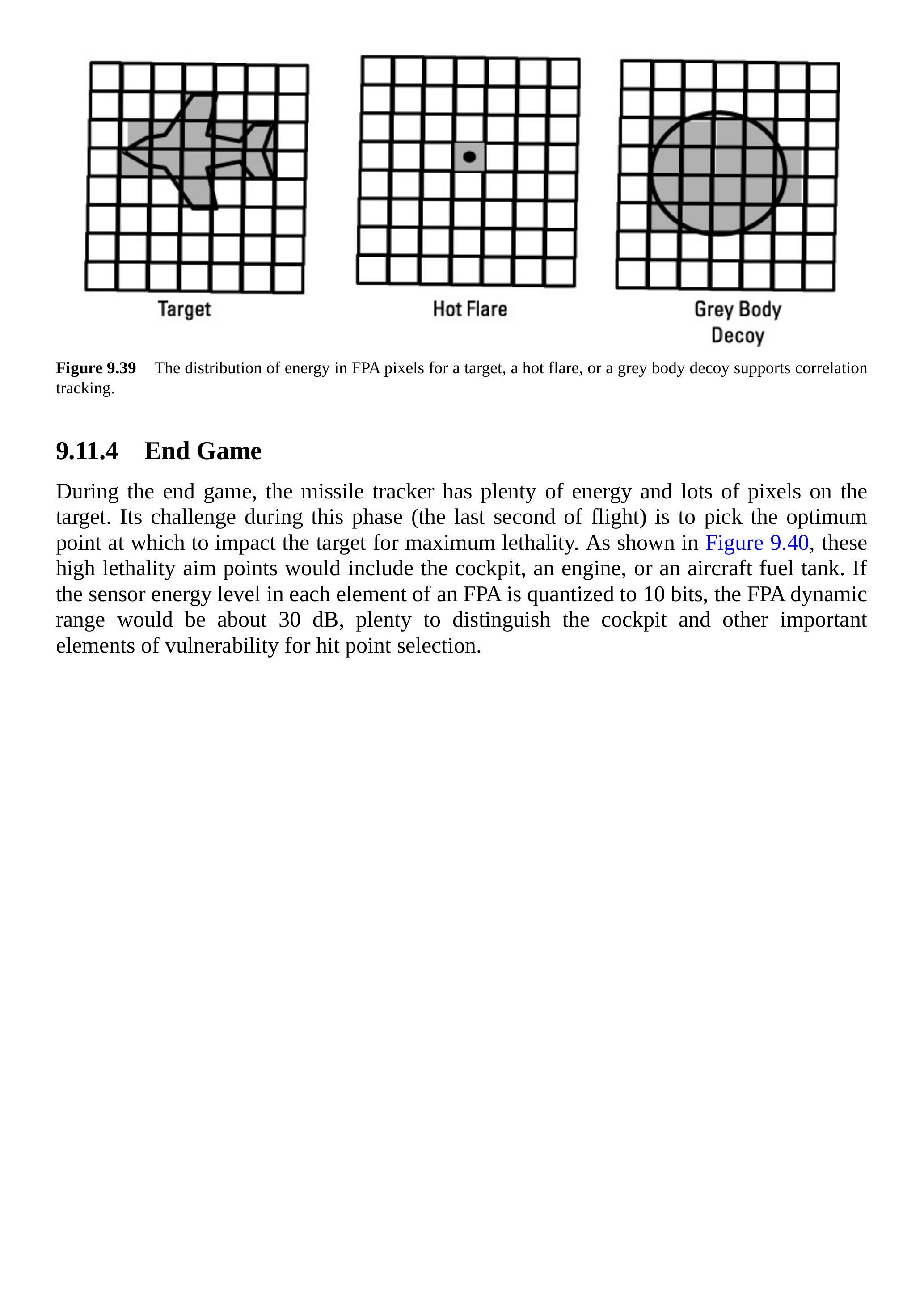 在中程阶段,跟踪用 FPA 通常在目标飞机上覆盖 \(7 \times 7\) 或 \(9 \times 9\) 个像素。图 9.39 显示了一个 \(7 \times 7\) 像素阵列观察目标、热燃烧弹和灰体诱饵的情况。注意目标呈现出复杂的像素能量分布。热燃烧弹体积小,因此将大量能量集中在单个像素上。灰体诱饵在多个像素上提供相当于有效目标的能量。记住,这种类型的诱饵使用快速氧化的箔片,它们展开以填充较大的体积。然而,能量图案的形状与目标的空间能量分布不同。关键在于,这个形状不必与预存的飞机图像完全匹配。跟踪器可以因为新的能量分布与之前短时间内看到的能量分布不相关而拒绝诱饵。
