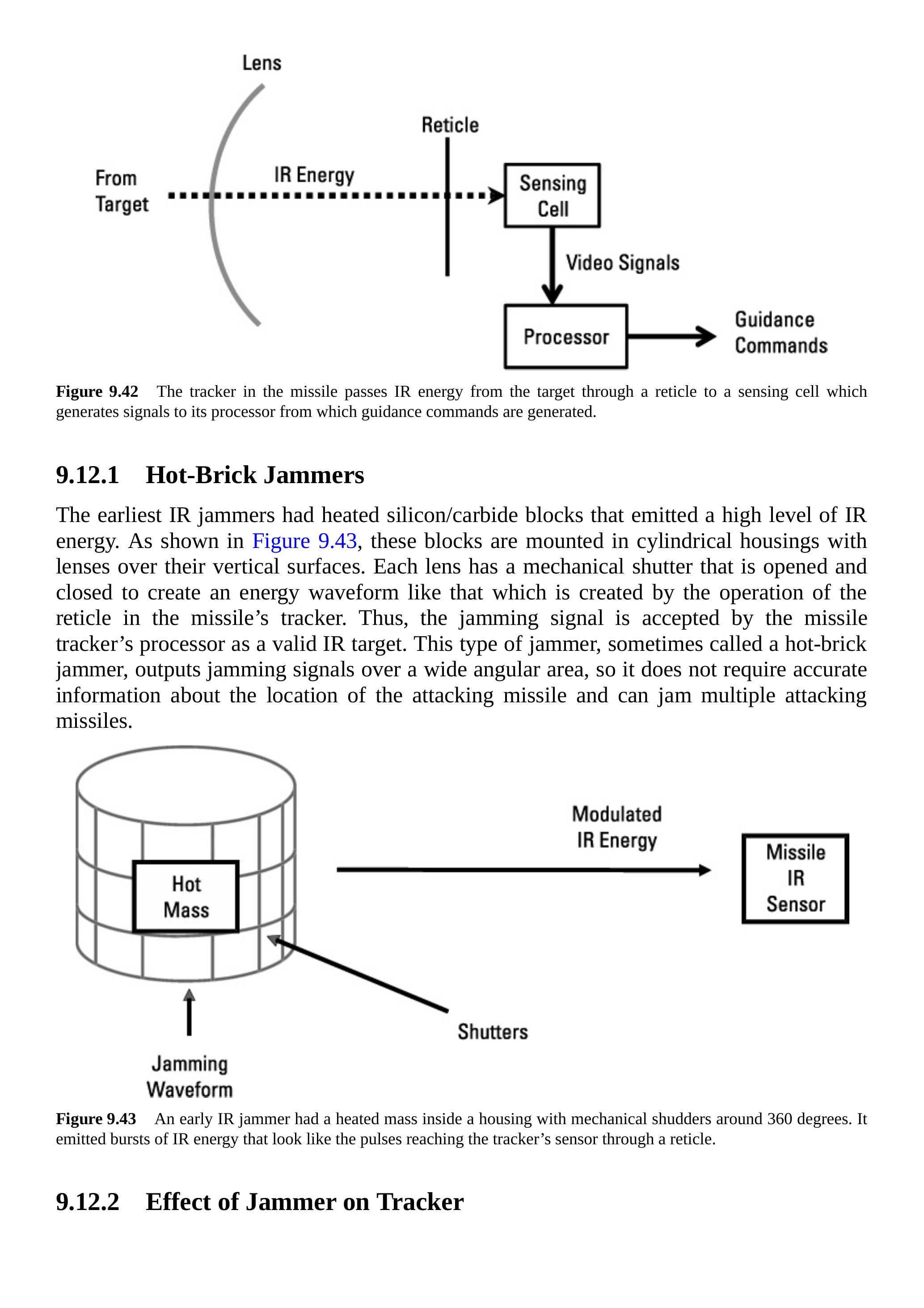 如图 9.41 所示,红外导弹跟踪目标飞机的某部分红外能量。目标飞机上的干扰器将调制的红外能量指向来袭导弹。接收到的红外能量被处理,以确定导弹必须被引导的方向来追踪目标。图 9.42 显示了导弹跟踪器组件。红外能量通过透镜和光栅到达传感单元,该单元生成视频信号,由处理器生成导弹制导指令。
