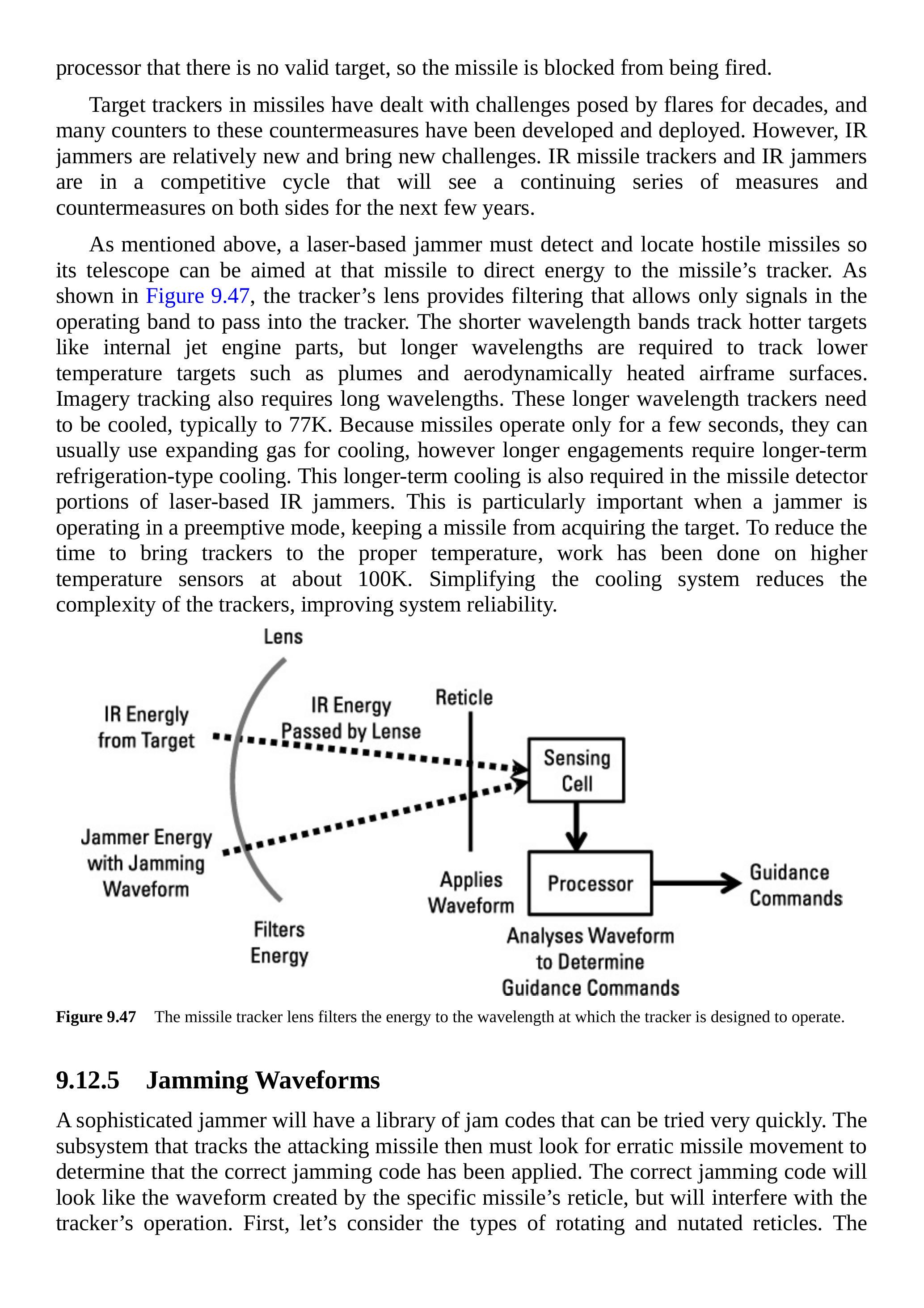 如前所述,基于激光的干扰器必须探测并定位来袭导弹,以便其望远镜能够指向该导弹,将能量定向传入导弹跟踪器。如图 9.47 所示,跟踪器的透镜提供了滤波功能,仅允许操作频段内的信号进入跟踪器。短波长波段用于跟踪较热的目标,如喷气发动机内部零件,而长波长用于跟踪较低温度的目标,如尾焰和气动加热的机身表面。成像跟踪也需要长波长。这些长波长跟踪器需要冷却,通常为 77 K。由于导弹通常仅运行几秒钟,它们可以使用膨胀气体进行冷却,而较长时间的作战需要类似制冷的长期冷却。这种长期冷却同样适用于基于激光的红外干扰器中的导弹探测器部分。当干扰器以先发制人的模式操作,阻止导弹获取目标时,这一点尤为重要。为了缩短跟踪器达到适宜温度的时间,已经开发出约 100 K 的高温传感器。简化冷却系统可以降低跟踪器的复杂性,提高系统可靠性。