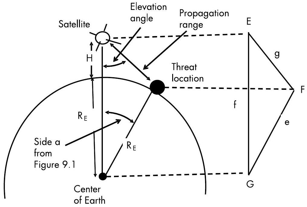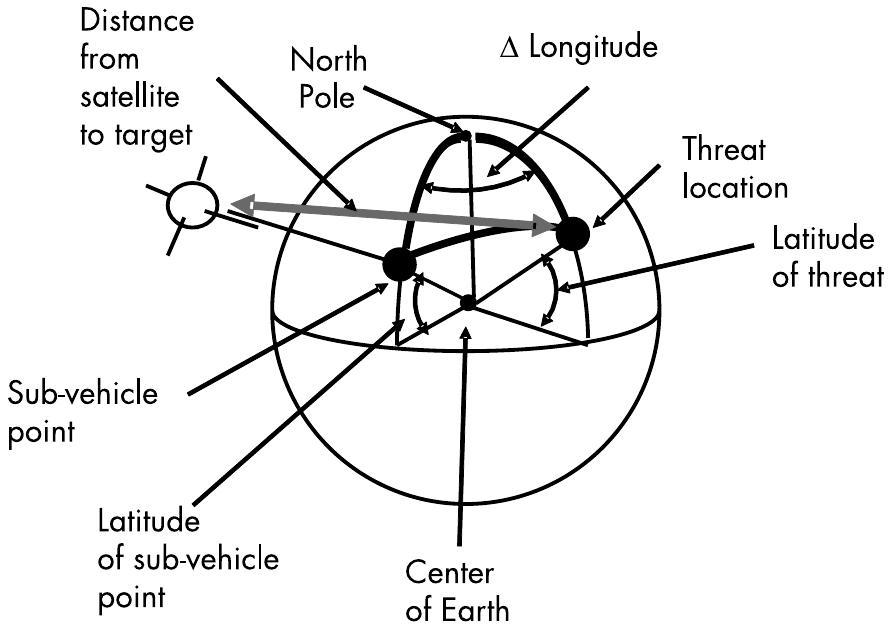 图 10.2:从天底方向的仰角以及卫星到威胁目标的距离,可以通过卫星、威胁目标和地心定义的平面三角形来计算。