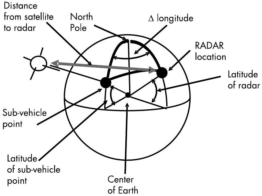 图 10.7 卫星到目标雷达的传播距离取决于轨道几何结构。