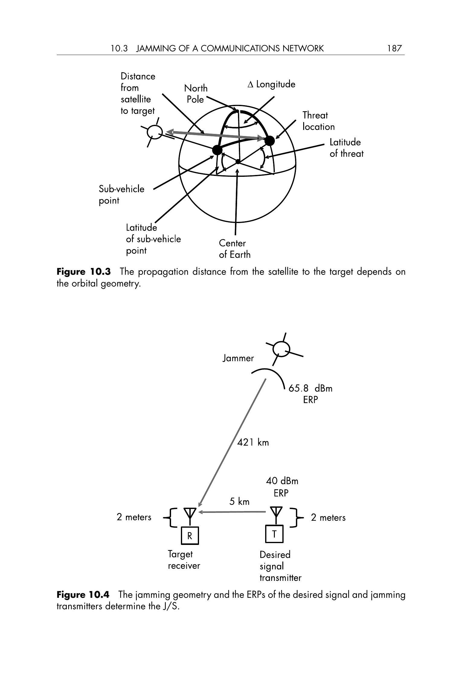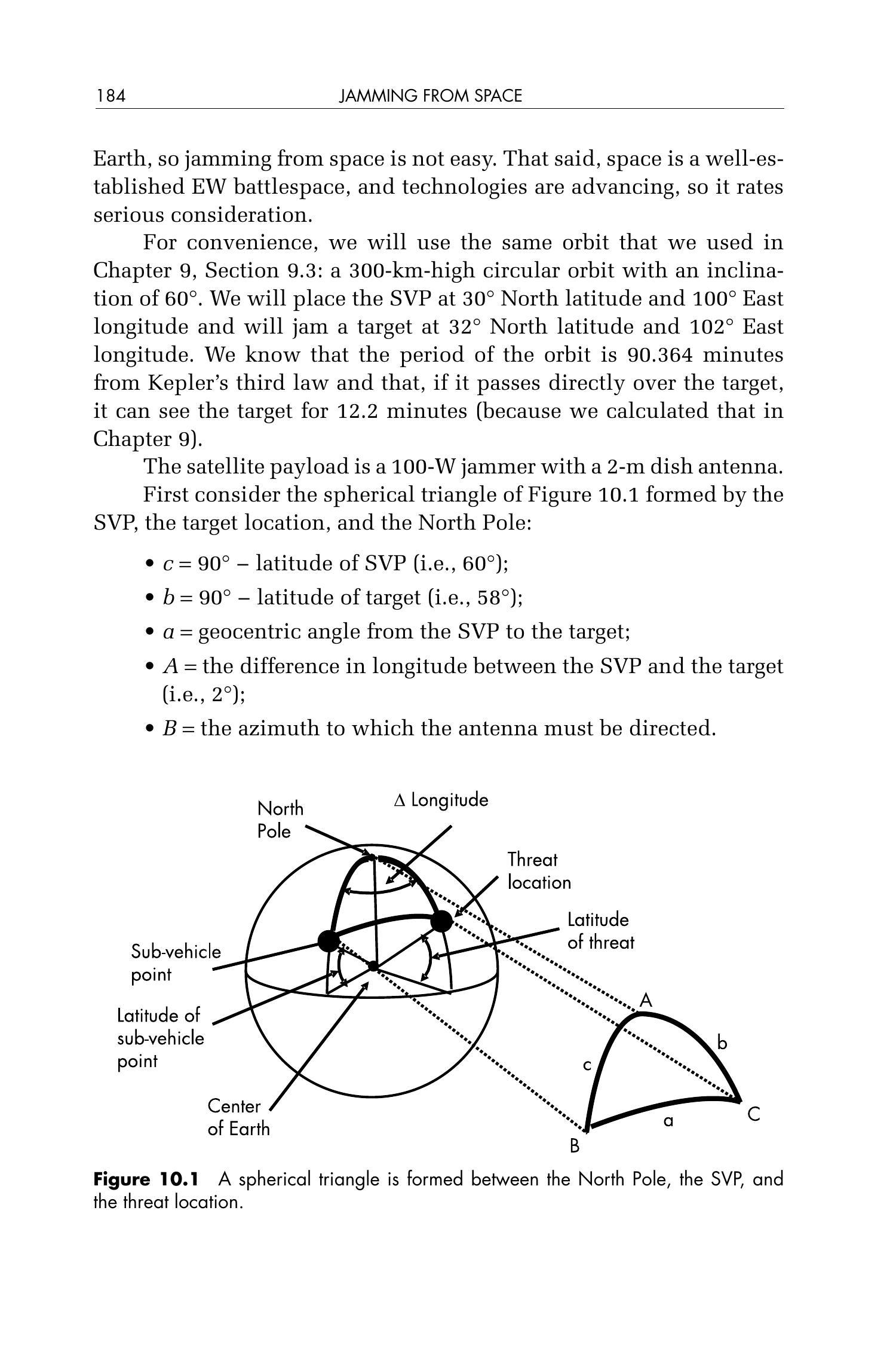 在第9章中,我们讨论了从太空拦截敌对地面信号的问题。现在我们将讨论从太空对敌对地面信号进行干扰的问题。我们将同时考虑通信干扰和雷达干扰。从太空进行干扰需要我们考虑干扰所发生轨道的几何限制。