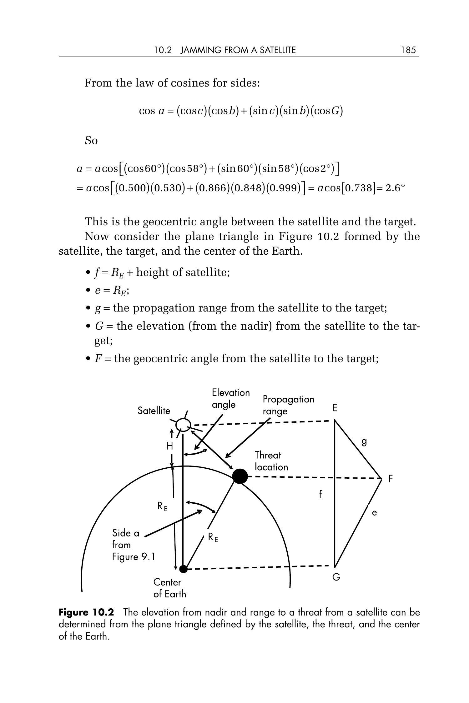 现在考虑图 10.2 中由卫星、目标和地心组成的平面三角形: