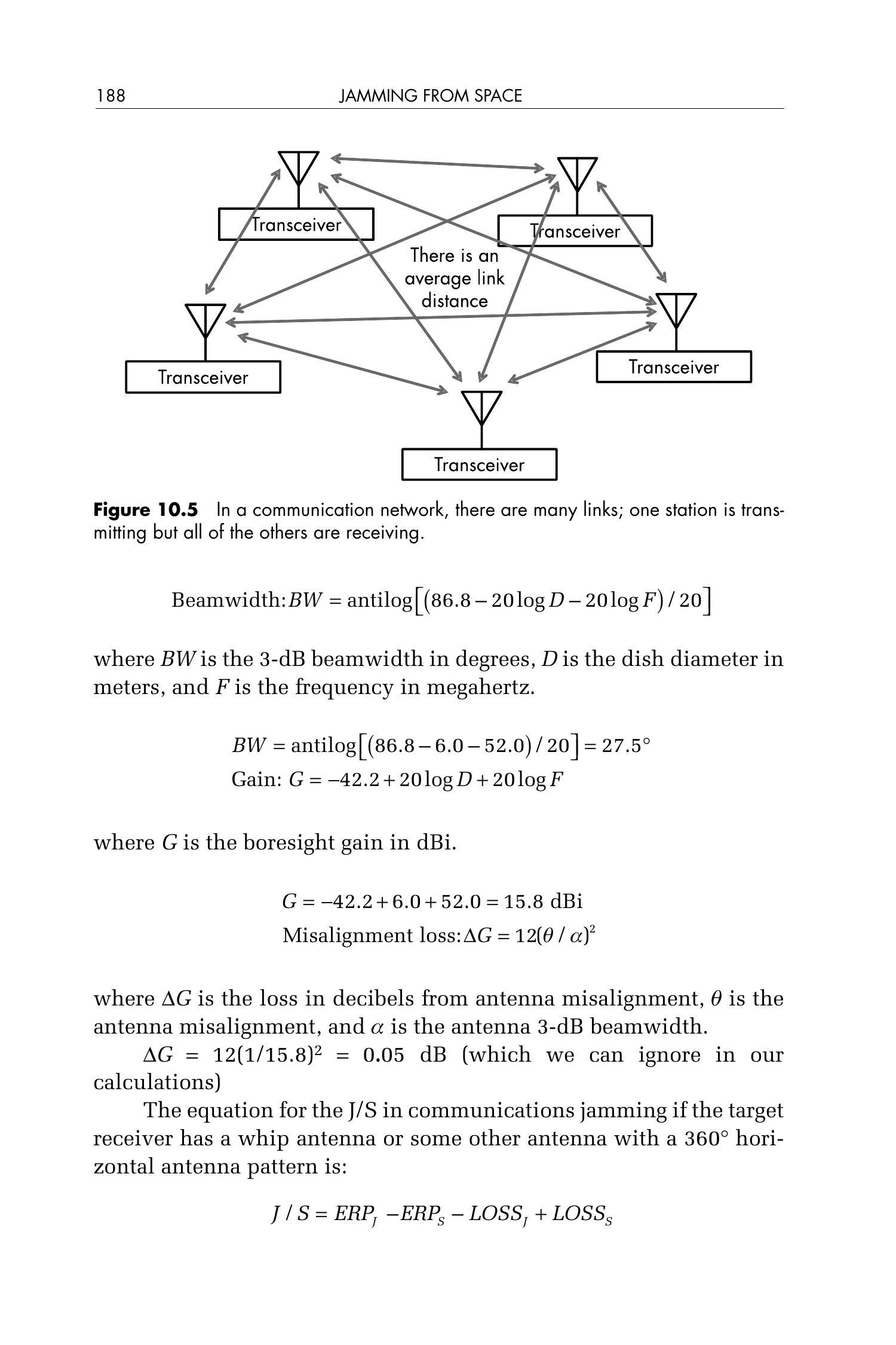 值得注意的是,如果卫星处于该网络的地平线方向(即与目标网络间距 \(1,978\,\mathrm{km}\)),考虑 1 dB 大气损耗后,\(J/S\) 将下降至 \(10.5\,\mathrm{dB}\)。