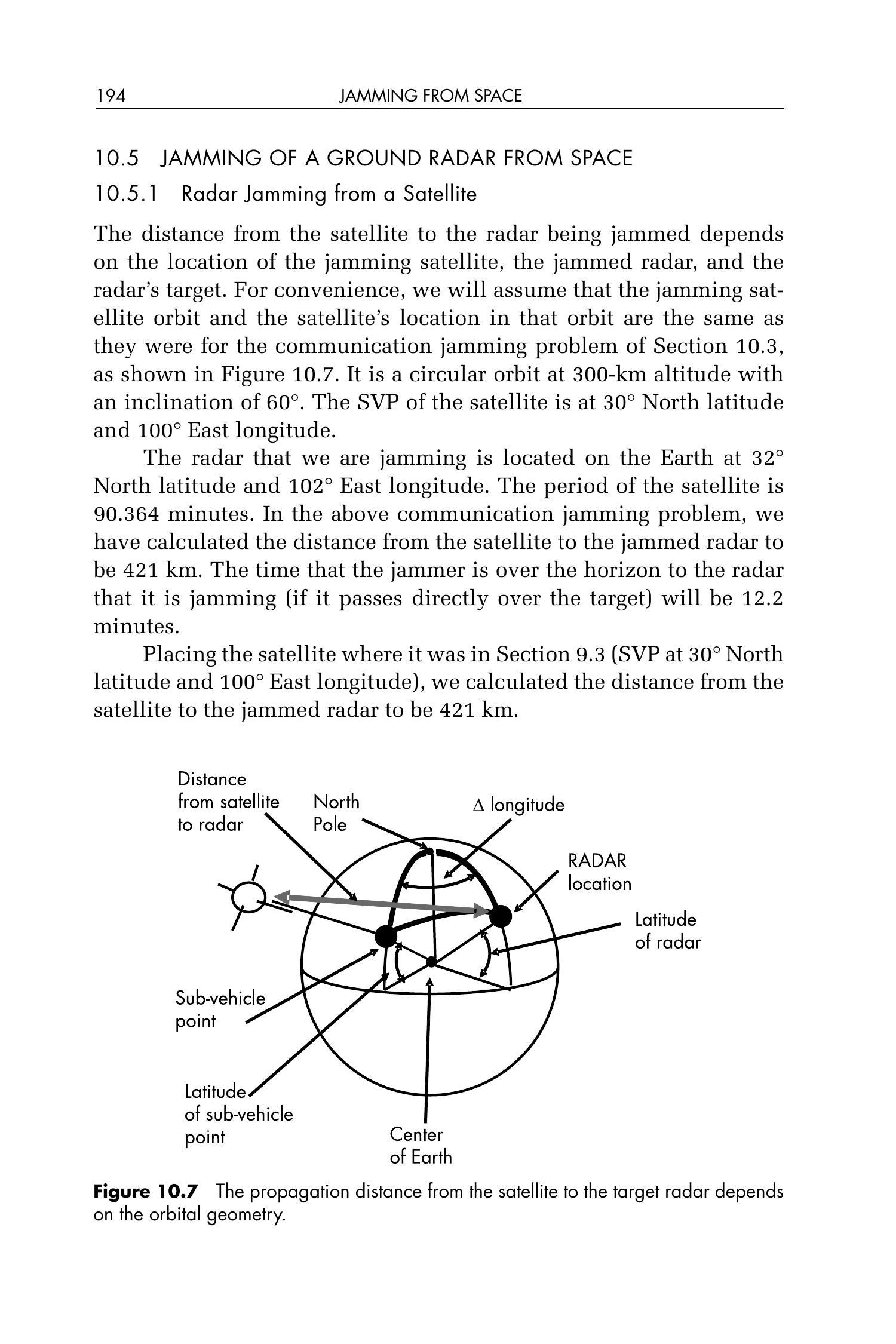 请记住,高度 \(300\ \mathrm{km}\) 的卫星能对目标雷达实施干扰的时间仅为 12.2 分钟。虽然这对于某些战术场景可能足够,但若要持续对 10.5.2 节中的雷达进行干扰,则必须使用多个卫星。如果采用同步轨道卫星,其距离被干扰雷达约为 \(37,000\ \mathrm{km}\)。