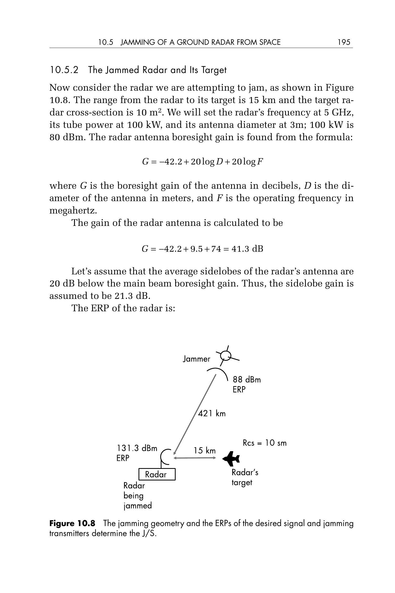 现在考虑我们试图干扰的雷达,如图 10.8 所示。该雷达到其目标的距离为 15 km,目标的雷达散射截面(RCS)为 \(10\ \mathrm{m}^2\)。设定雷达的工作频率为 5 GHz,发射管功率为 100 kW,天线直径为 \(3\ \mathrm{m}\);100 kW 等于 80 dBm。雷达天线的波束增益通过如下公式计算: