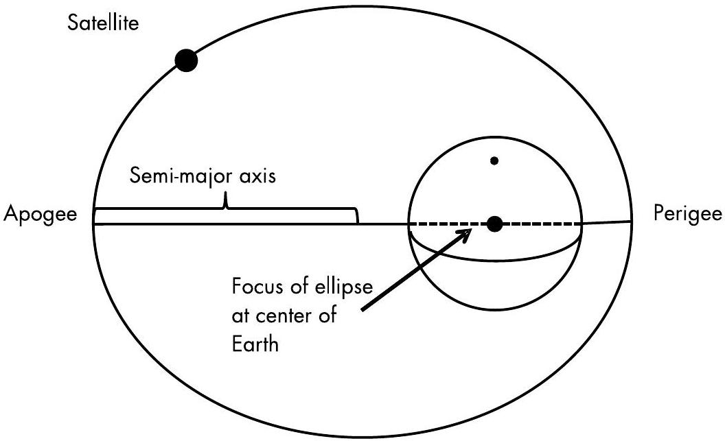 \(\mathbf{a}\) 是图 3.1 所示的半长轴(semi-major axis)。这是卫星椭圆轨道长轴的一半,也代表卫星到地球中心的平均距离。对于圆形轨道来说,它就是轨道半径。处于圆形轨道的卫星高度是恒定的:即轨道半径减去地球半径。