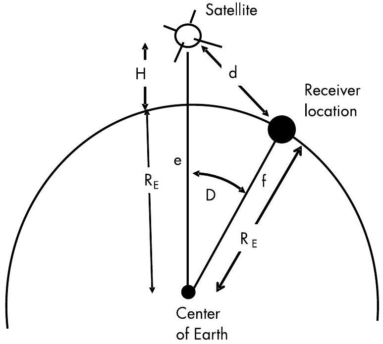 图 3.6 的平面三角形由卫星、接收机位置和地球中心构成。角 D 等于边 a(即 \(35.1^{\circ}\)),边 e 为 \(7,371 \mathrm{~km}\),边 f 为 \(6,371 \mathrm{~km}\)。