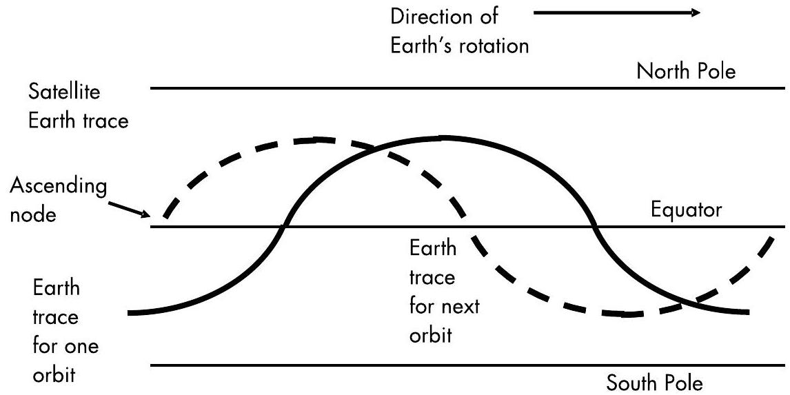 图 3.7 显示了卫星两次轨道的地表轨迹。第一次轨迹用实线表示,下一次轨迹用虚线表示。轨道实际上会受到山脉和其他地表地形的影响,但本讨论中假设地球为完美球体,因此轨道相对于地心保持不变,而地球则在轨道内自转。