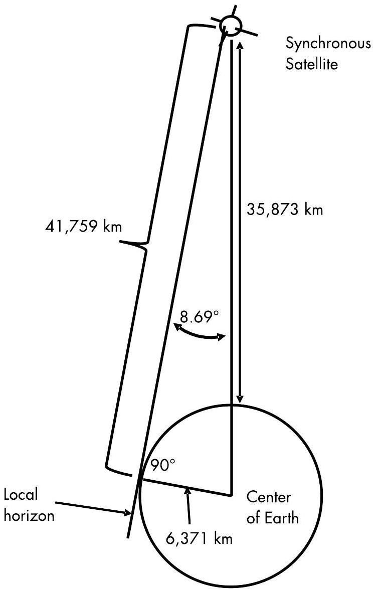 图 3.10 位于地平线上的同步卫星,其与地面站的距离为 \(41,759 \mathrm{~km}\)。