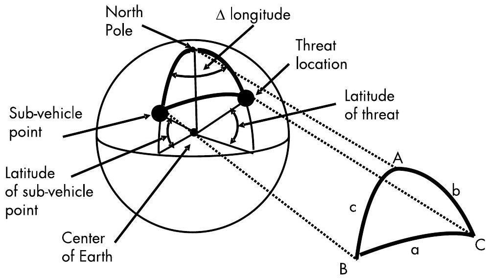 为计算方位角,我们需要考虑图 3.12 中由北极、子载点与威胁位置构成的球面三角形。