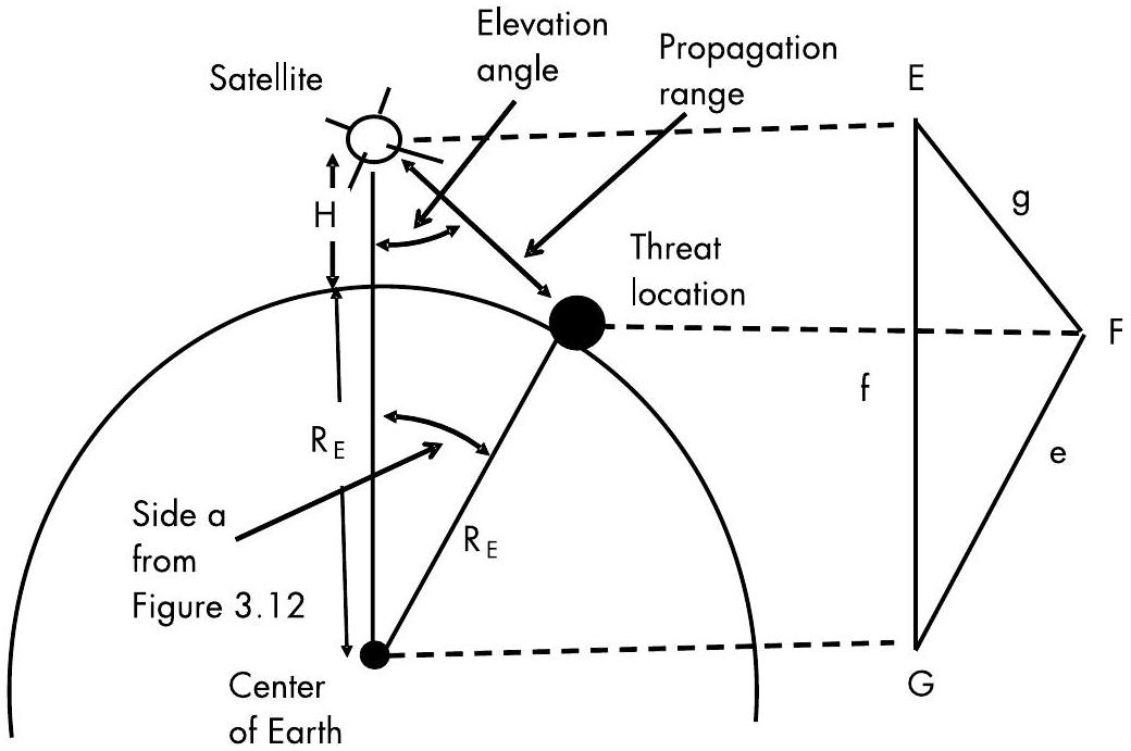 边 \(e\) 为地球半径(\(6,371 \mathrm{~km}\)),边 \(f\) 为轨道半长轴(地球半径加卫星高度 \(=10,560\) km),角 \(G\) 为图 3.12 中的边 \(a\)(\(21.57^{\circ}\)),边 \(g\) 是卫星与威胁之间的传播距离。