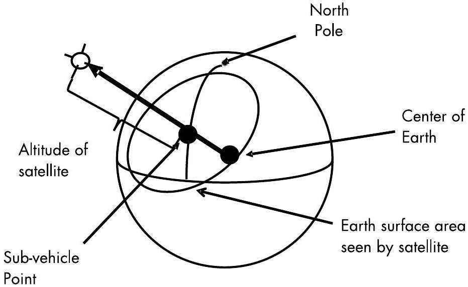位于卫星正下方的地球表面点称为子载点(Sub-Vehicle Point, SVP)。如图 3.4 所示,该点是从地球中心至卫星的连线与地球表面的交点。SVP 的纬度是从赤道到 SVP 的地心角,SVP 的经度是通过该点的经线与通过英国格林尼治的经线之间的夹角。