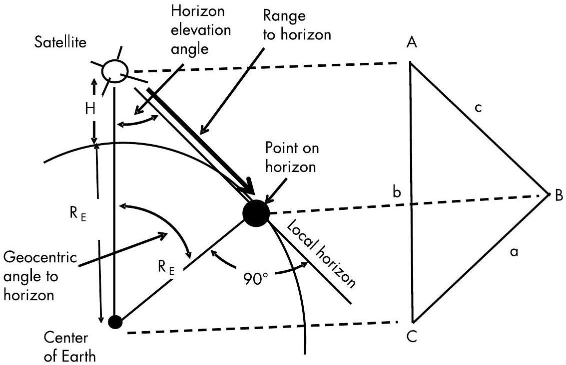 图 3.15 从卫星到地平线的距离可通过卫星、地平点与地球中心构成的平面三角形计算得出。