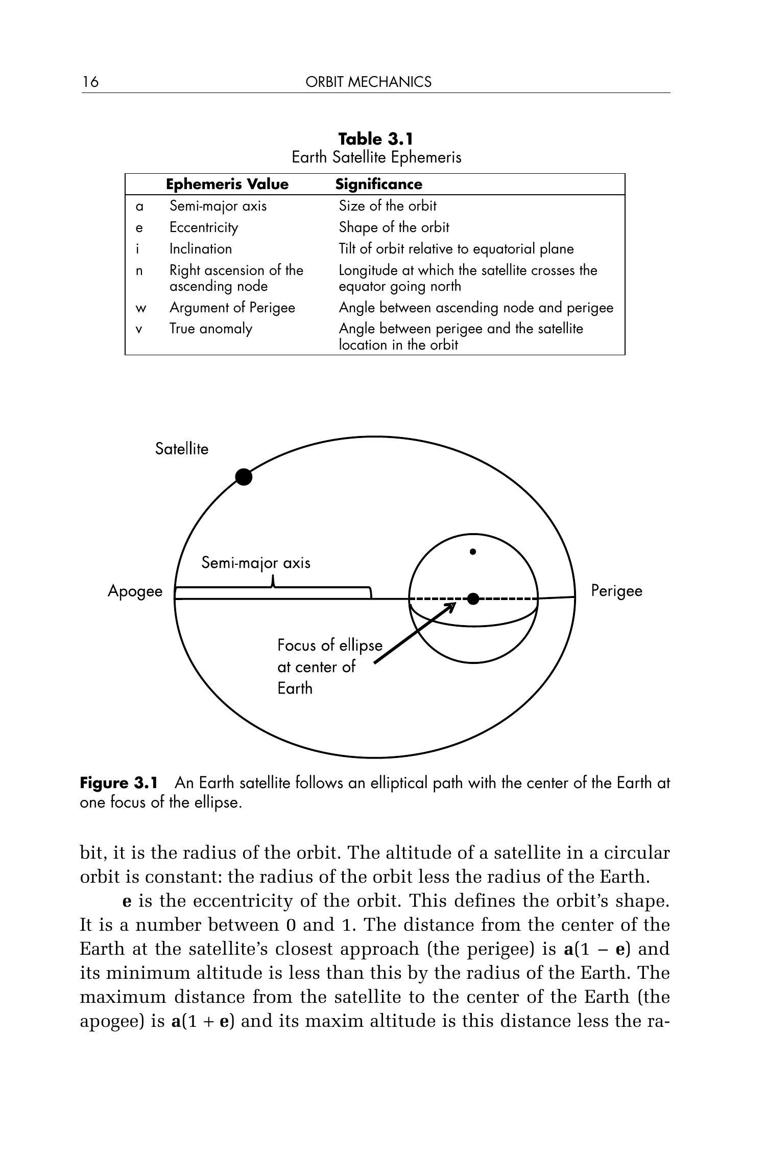\(\mathbf{a}\) 是图 3.1 所示的半长轴(semi-major axis)。这是卫星椭圆轨道长轴的一半,也代表卫星到地球中心的平均距离。对于圆形轨道来说,它就是轨道半径。处于圆形轨道的卫星高度是恒定的:即轨道半径减去地球半径。
