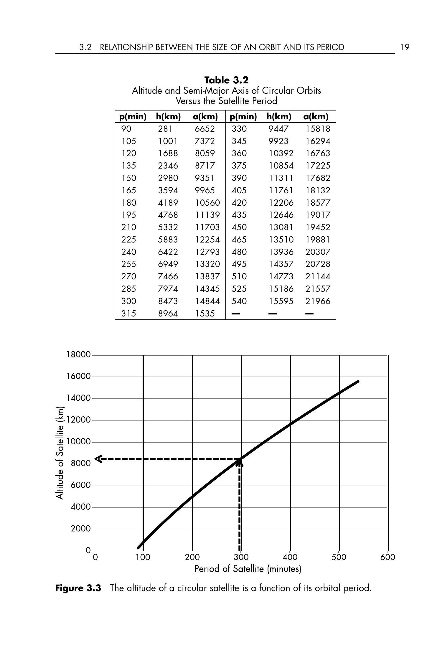 表 3.2 给出了周期从 1.5 小时到 9 小时的圆形地球卫星对应的高度。图 3.3 是圆形卫星轨道高度与周期之间关系的图示。例如,从 300 分钟处向上直线延伸至曲线,再向左延伸到高度轴,即得高度为 \(8,475 \mathrm{~km}\)。
