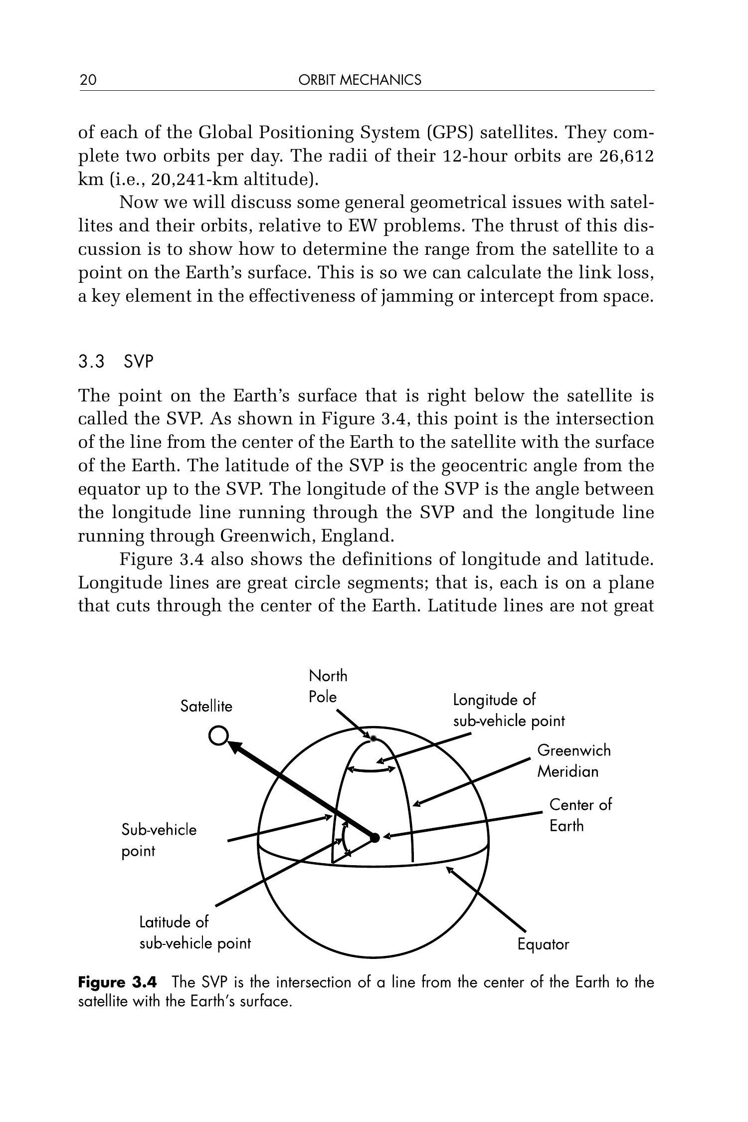 位于卫星正下方的地球表面点称为子载点(Sub-Vehicle Point, SVP)。如图 3.4 所示,该点是从地球中心至卫星的连线与地球表面的交点。SVP 的纬度是从赤道到 SVP 的地心角,SVP 的经度是通过该点的经线与通过英国格林尼治的经线之间的夹角。
