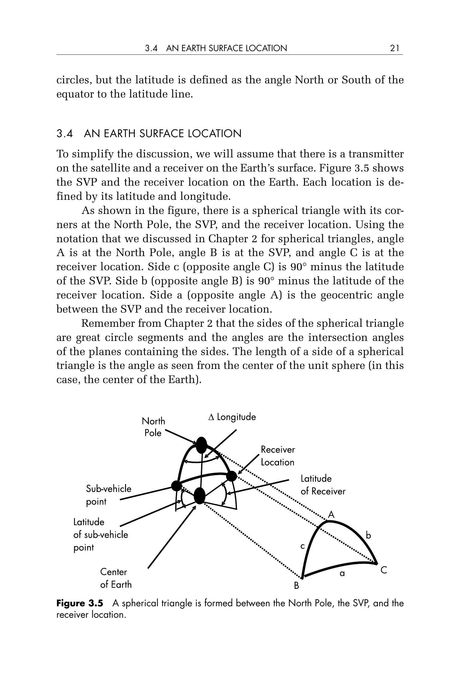 回忆第2章的内容,球面三角形的边是大圆弧段,其角是包含这些弧段的平面相交所形成的角。球面三角形中一条边的长度是从单位球(在此即地球)中心看该弧所张的角度。