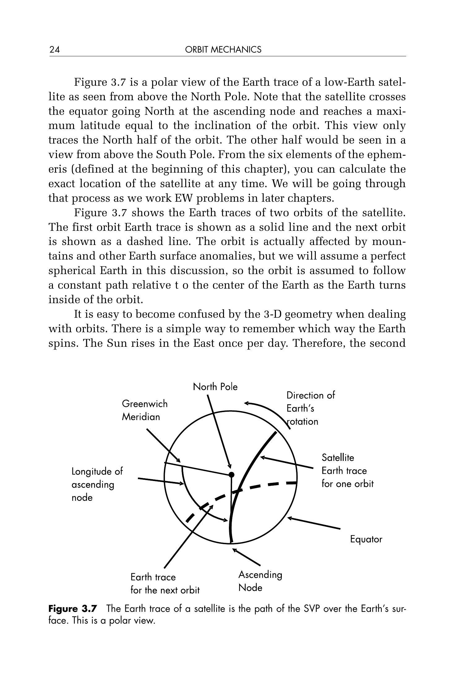 图 3.7 是从北极上空俯视的低轨道卫星地表轨迹图。注意卫星在升交点处向北穿越赤道,并在轨道上达到最大纬度,该纬度等于轨道倾角。该图只显示了轨道北半段的轨迹;轨道的另一半将出现在从南极上空俯视的视图中。根据第3章开始时介绍的六个星历参数,可以计算任意时刻卫星的精确位置。我们将在后续的电子战问题中逐步进行该过程。