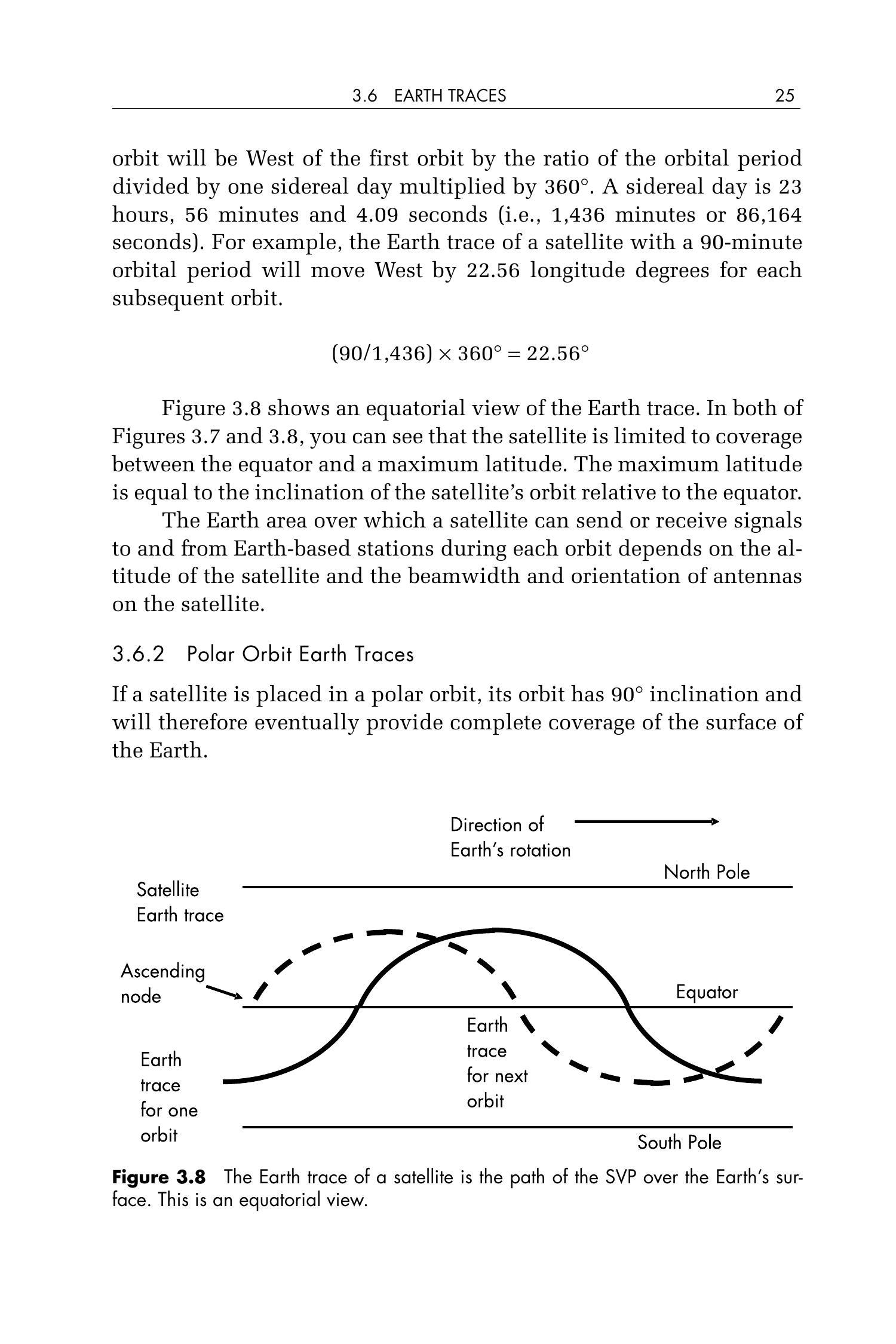 图 3.8 显示了地表轨迹的赤道视图。在图 3.7 和图 3.8 中都可看出,卫星的覆盖范围受限于赤道与最大纬度之间的区域。最大纬度等于卫星轨道相对于赤道的倾角。