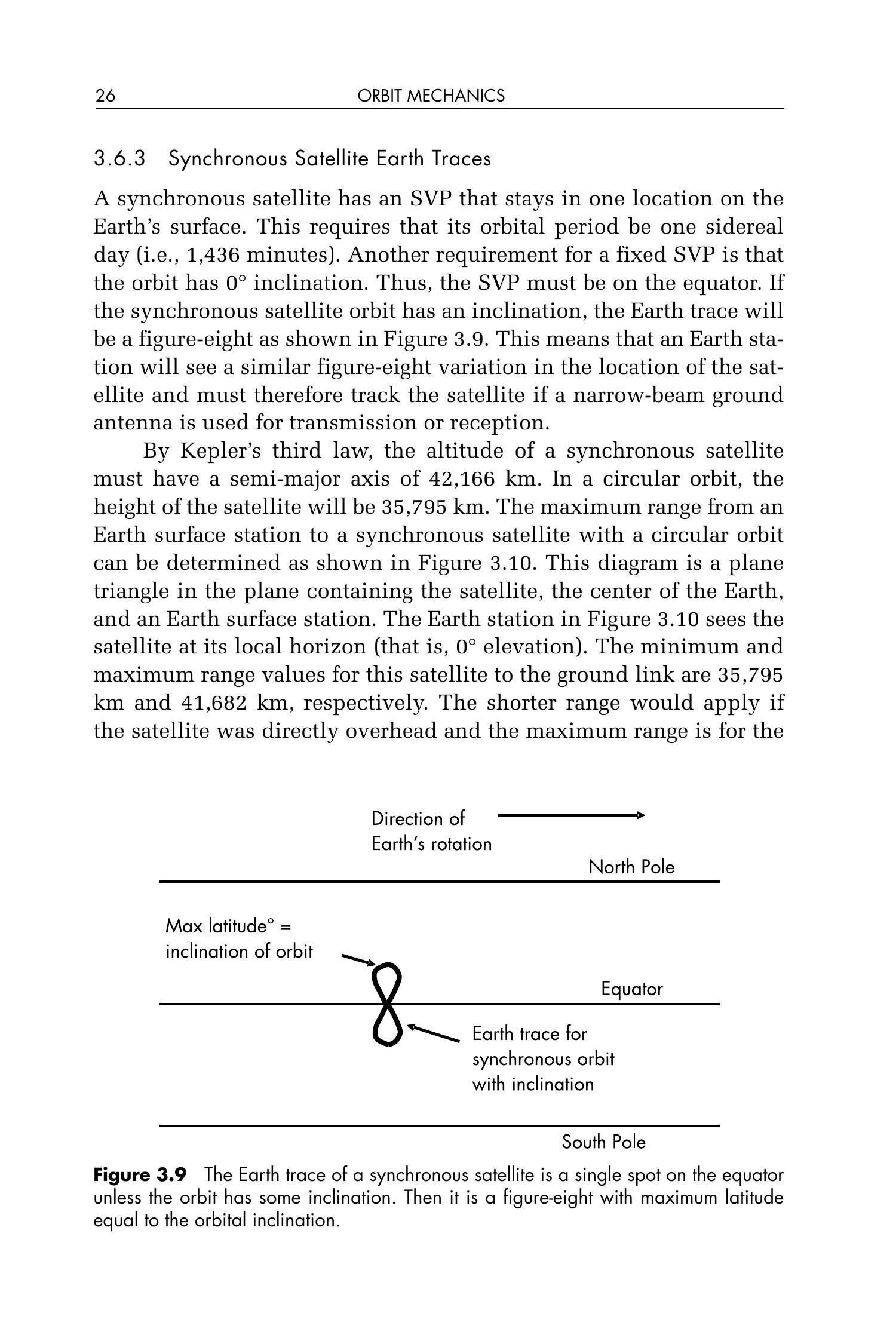 同步卫星的子载点固定在地球表面某一位置。为实现这一点,其轨道周期必须等于一个恒星日(即 1,436 分钟)。另一个条件是轨道倾角为 \(0^{\circ}\),也就是说子载点必须位于赤道上。