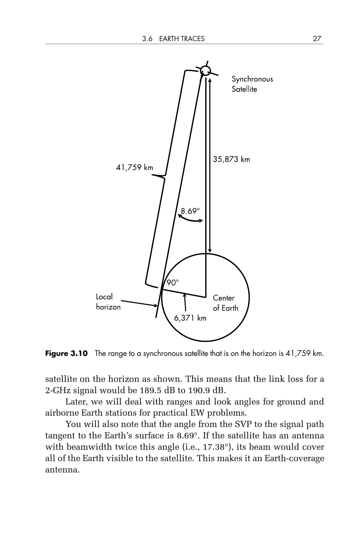 你还将注意到,从子载点(SVP)到信号路径切线与地球表面相切的角度为 \(8.69^{\circ}\)。如果卫星的天线波束宽度是该角度的两倍(即 \(17.38^{\circ}\)),其波束就能覆盖所有卫星可见的地表区域。这种天线称为地球覆盖型天线(Earth-coverage antenna)。