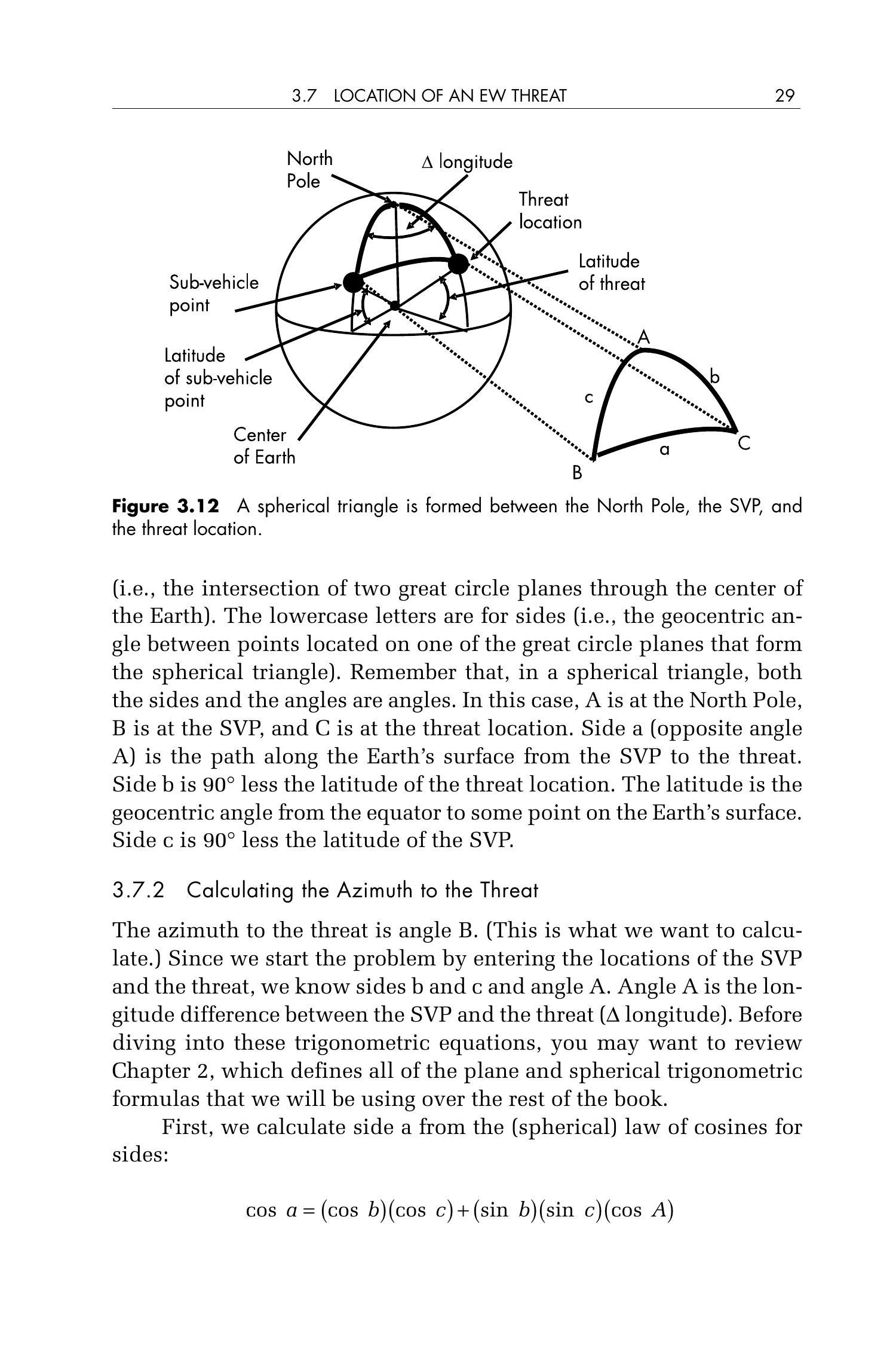 为计算方位角,我们需要考虑图 3.12 中由北极、子载点与威胁位置构成的球面三角形。