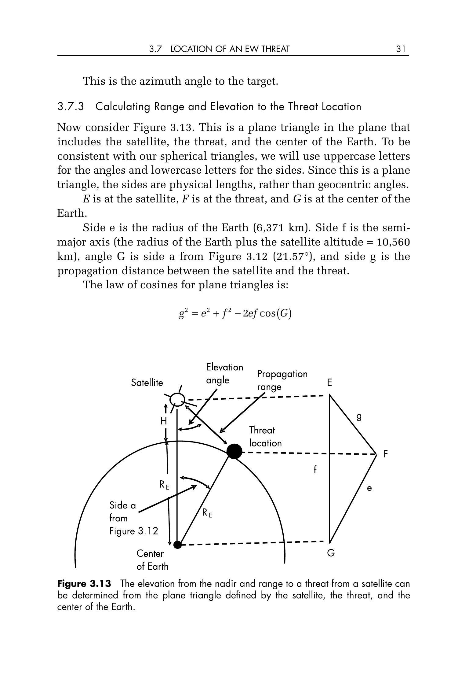 边 \(e\) 为地球半径(\(6,371 \mathrm{~km}\)),边 \(f\) 为轨道半长轴(地球半径加卫星高度 \(=10,560\) km),角 \(G\) 为图 3.12 中的边 \(a\)(\(21.57^{\circ}\)),边 \(g\) 是卫星与威胁之间的传播距离。