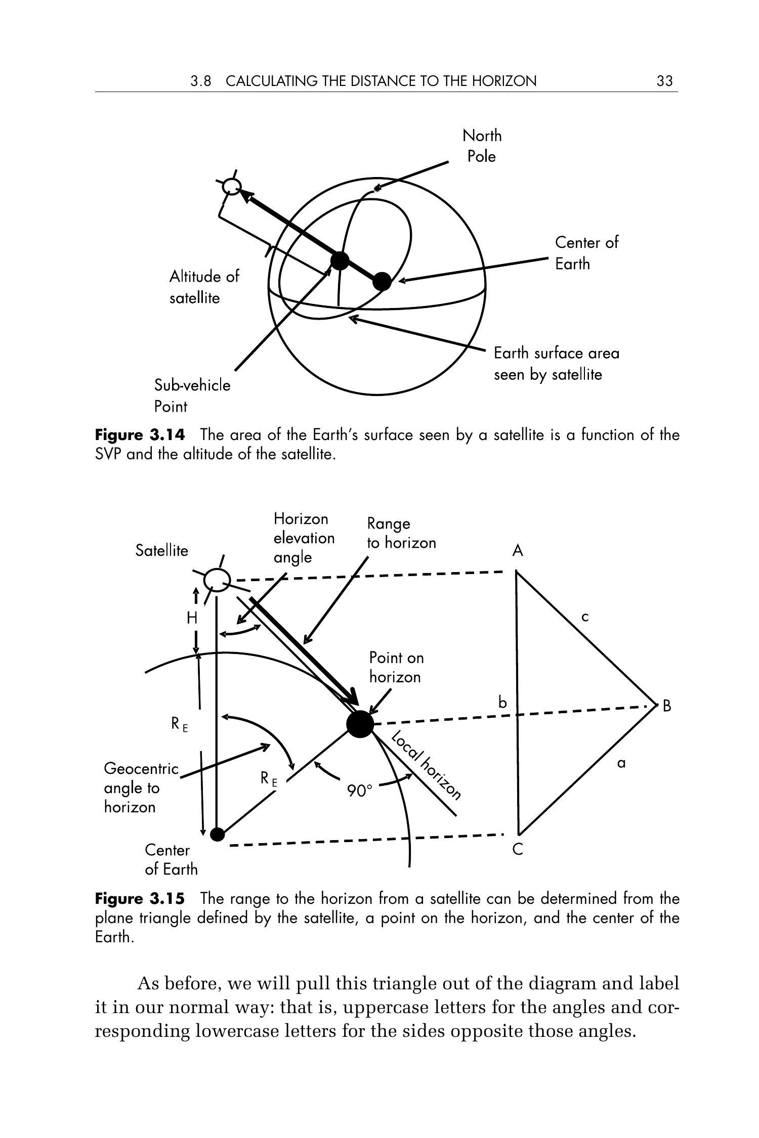 图 3.15 从卫星到地平线的距离可通过卫星、地平点与地球中心构成的平面三角形计算得出。