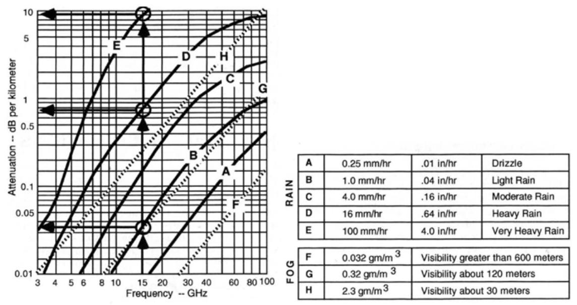 图5.6展示了由降雨引起的每公里链路损耗。使用该图表时,首先在横轴(abscissa)上找到工作频率,然后垂直向上移动至对应预期降雨率的曲线,再向左水平移动至纵轴(ordinate),即可读出每公里的雨衰值。图5.6中附带的表格列出了不同降雨率和雾密度所对应的损耗曲线。随后,将每公里的损耗乘以链路穿过降雨区域的实际距离,即可得到总雨衰。