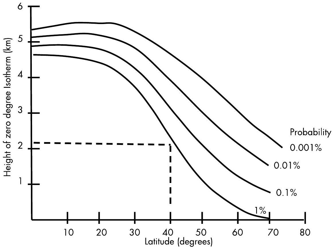 对于空间链路,还存在另一个复杂因素:太空中并无降雨。因此,雨衰仅作用于从降雨开始的高度(即地面站所在位置)到降雨层顶部之间的一段路径。图5.7显示了 \(0^{\circ}\) 等温层(\(0^{\circ}\) isotherm)高度随纬度和概率的变化关系。降雨起始于大气温度为 \(0^{\circ}\mathrm{C}\) 的高度(即 \(0^{\circ}\) 等温层);在此高度以上,降水为冰晶形态,而冰对信号的衰减可忽略不计。考虑从地面终端观测卫星的仰角(elevation angle),我们可以将信号穿过降雨区域的路径长度计算为 \(0^{\circ}\) 等温层高度除以该仰角的正弦值,如图5.8所示。需要注意的是,如果链路连接的是卫星与飞机,则“地面终端”位于飞机所在高度。由于降雨衰减通常采用概率统计方法进行评估,而非实时精确计算,因此图5.7(\(0^{\circ}\) 等温层高度随纬度和概率变化的图表)非常有用。例如,若我们要求链路性能达到 \(99\%\) 的可靠性,则从地面站所在纬度出发,向上找到对应 \(1\%\) 概率(即 \(99\%\) 可靠性)的曲线,再向左读取纵轴,即可获得预期的 \(0^{\circ}\) 等温层高度。举例如下:假设位于 \(40^{\circ}\) 纬度,\(1\%\) 概率对应的等温层高度约为 \(2\,\mathrm{km}\)。若卫星位于当地地平线上方 \(30^{\circ}\),则 \(\sin(30^{\circ}) = 0.5\),因此信号穿过降雨区的距离为 \(2\,\mathrm{km} / 0.5 = 4\,\mathrm{km}\)。若此时为强降雨且链路工作在 \(15\,\mathrm{GHz}\),根据图5.6,每公里雨衰为 \(0.73\,\mathrm{dB/km}\),总雨衰即为 \(0.73 \times 4 = 2.9\,\mathrm{dB}\)。若为小雨,则每公里损耗仅为 \(0.033\,\mathrm{dB/km}\),即使路径长达 \(10\,\mathrm{km}\),总雨衰也仅为 \(0.3\,\mathrm{dB}\)。