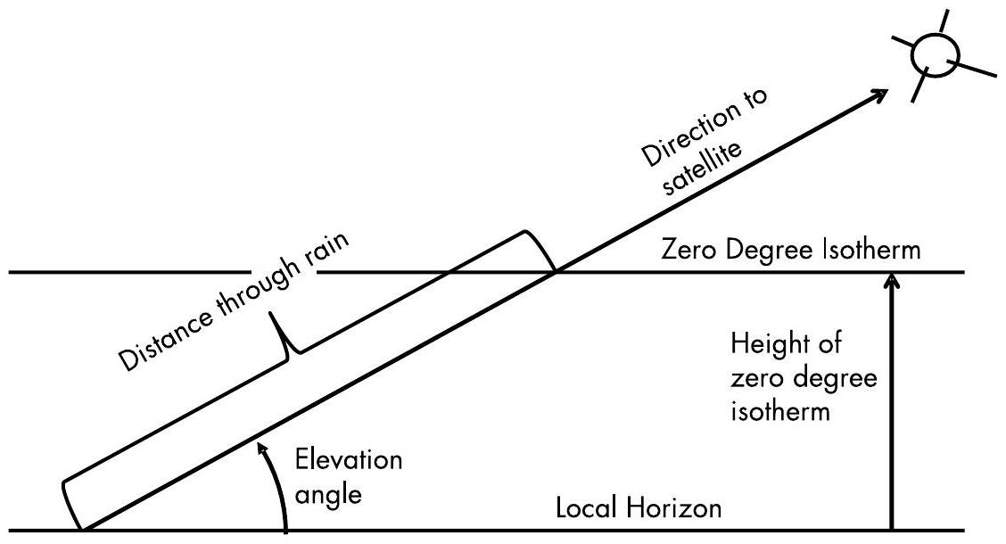 图5.8 雨衰适用的距离是链路中位于 \(0^{\circ}\) 等温层以下的部分。