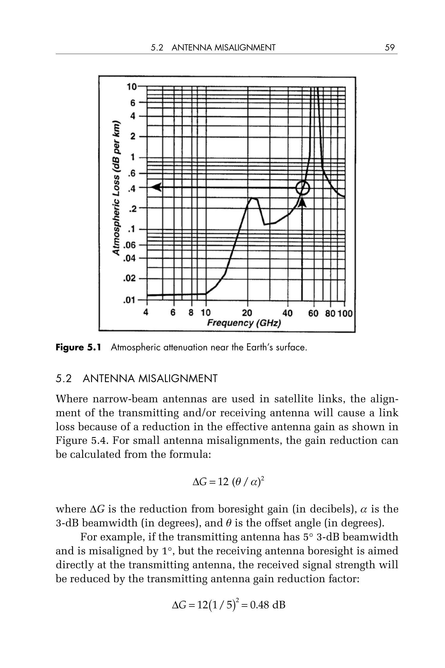 在卫星链路中使用窄波束天线时,发射和/或接收天线的对准偏差会导致链路损耗,这是因为有效天线增益降低,如图5.4所示。对于较小的天线失配角度,增益降低量可由以下公式计算: