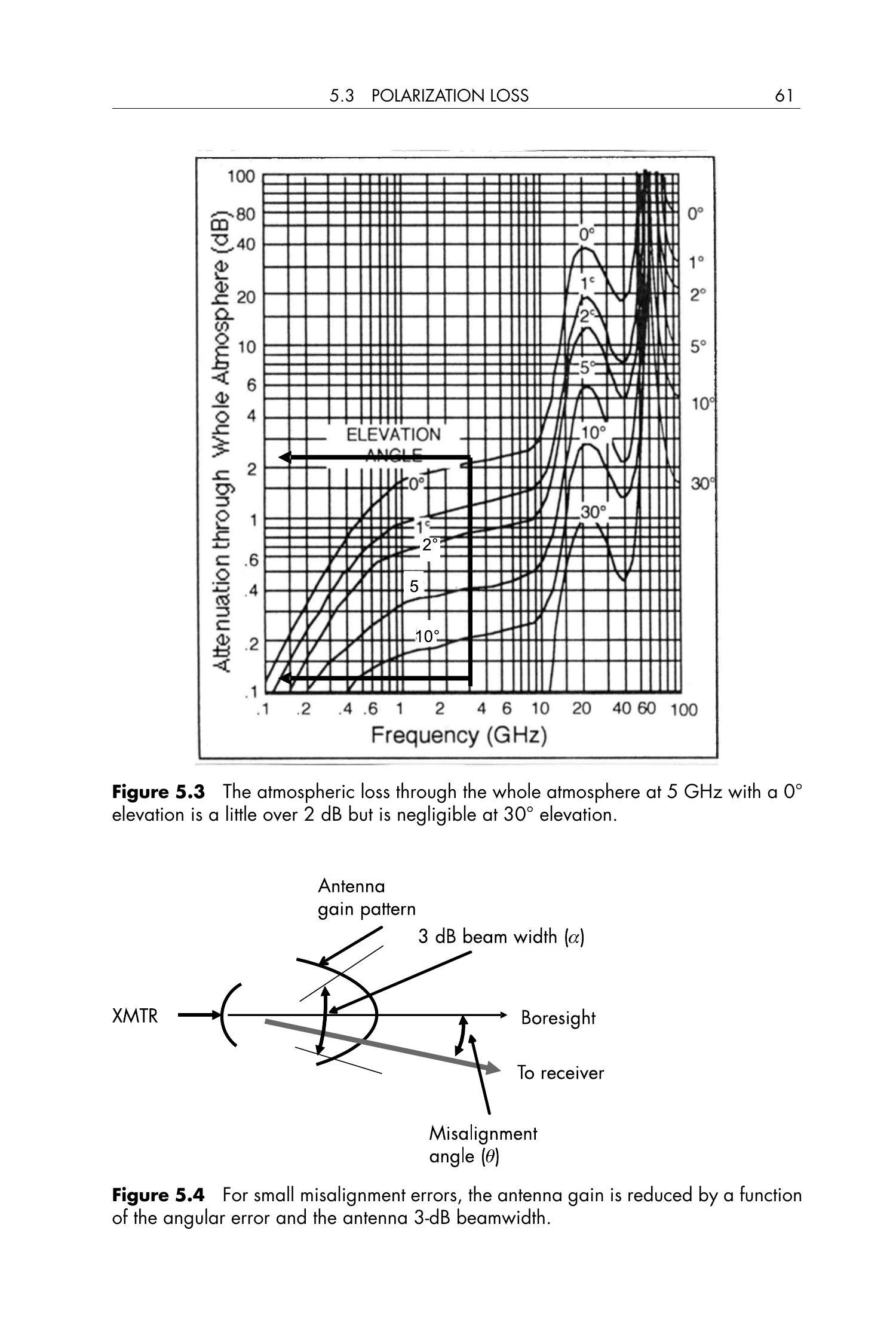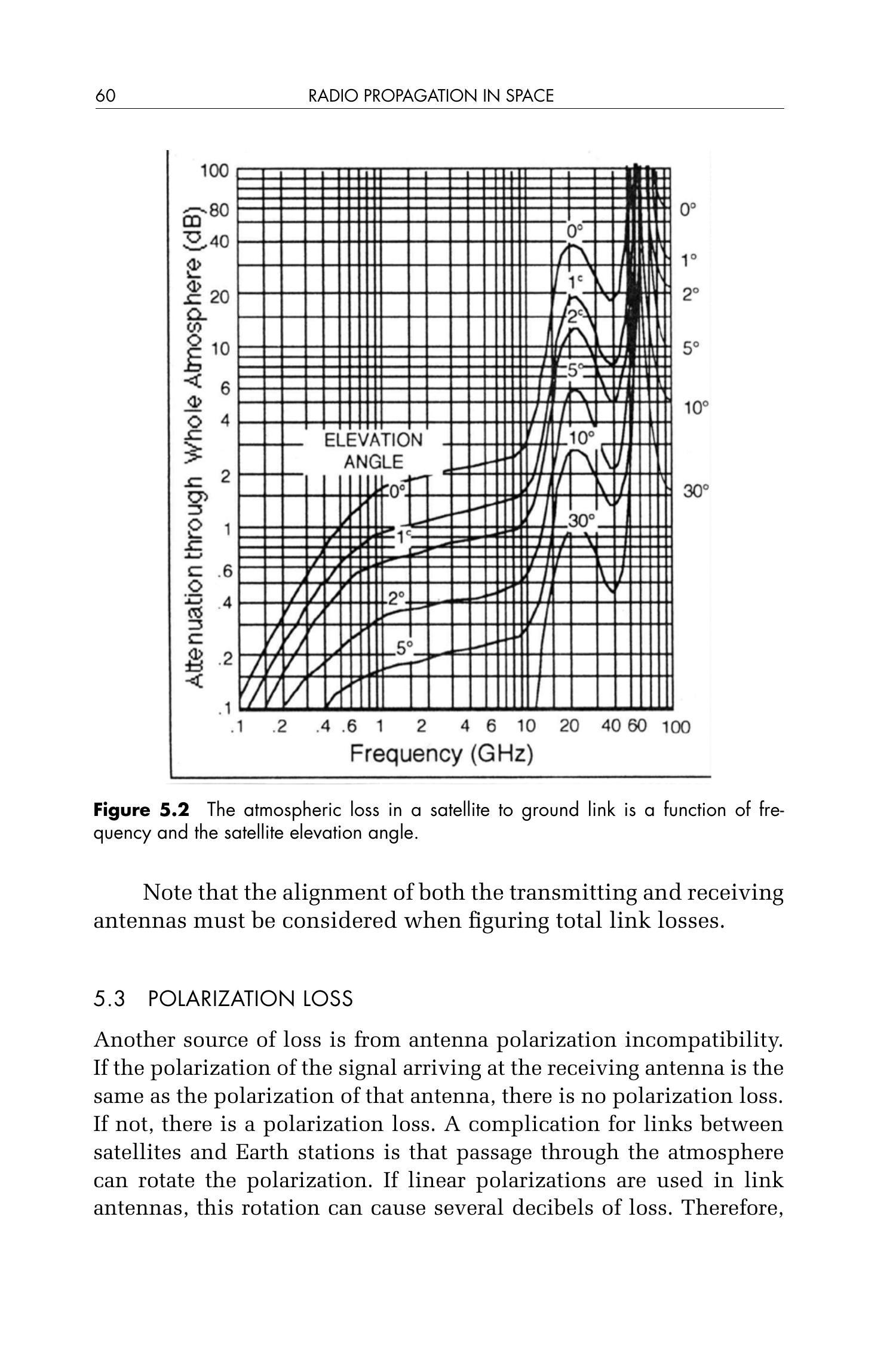 图5.1展示了在大气层内传输的信号每公里的大气损耗。然而,当通信链路是卫星与地面之间时,我们应使用图5.2。该图表示信号穿过整个大气层的总损耗,是频率和卫星相对于当地地平线的仰角(elevation angle)的函数。例如,对于一个 \(3\,\mathrm{GHz}\) 的信号,在 \(30^{\circ}\) 仰角时大气损耗可忽略不计,但在地平线方向(仰角为 \(0^{\circ}\))时损耗约为 \(2.2\,\mathrm{dB}\),如图5.3所示。