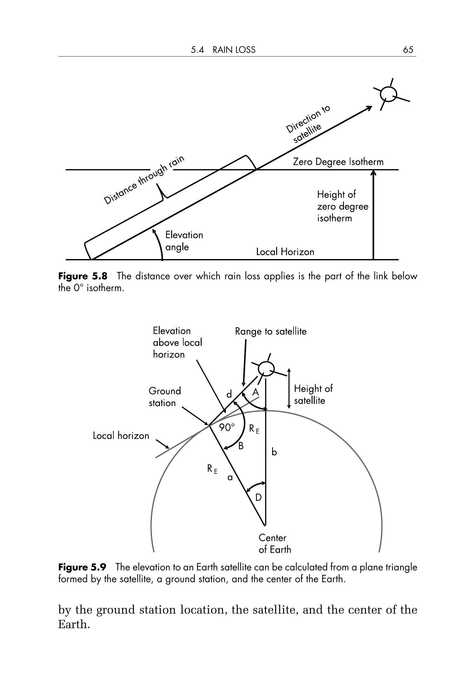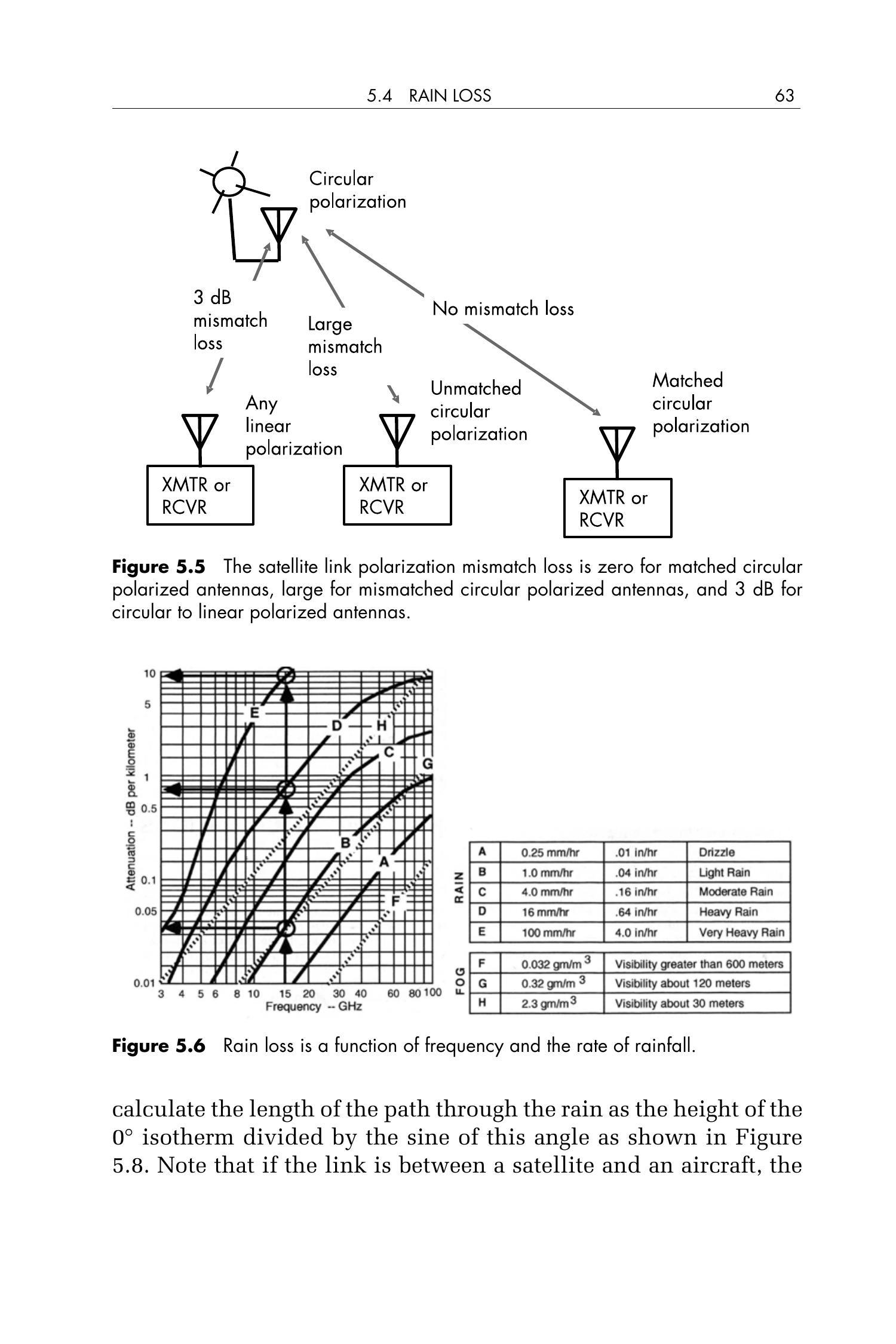 对于空间链路,还存在另一个复杂因素:太空中并无降雨。因此,雨衰仅作用于从降雨开始的高度(即地面站所在位置)到降雨层顶部之间的一段路径。图5.7显示了 \(0^{\circ}\) 等温层(\(0^{\circ}\) isotherm)高度随纬度和概率的变化关系。降雨起始于大气温度为 \(0^{\circ}\mathrm{C}\) 的高度(即 \(0^{\circ}\) 等温层);在此高度以上,降水为冰晶形态,而冰对信号的衰减可忽略不计。考虑从地面终端观测卫星的仰角(elevation angle),我们可以将信号穿过降雨区域的路径长度计算为 \(0^{\circ}\) 等温层高度除以该仰角的正弦值,如图5.8所示。需要注意的是,如果链路连接的是卫星与飞机,则“地面终端”位于飞机所在高度。由于降雨衰减通常采用概率统计方法进行评估,而非实时精确计算,因此图5.7(\(0^{\circ}\) 等温层高度随纬度和概率变化的图表)非常有用。例如,若我们要求链路性能达到 \(99\%\) 的可靠性,则从地面站所在纬度出发,向上找到对应 \(1\%\) 概率(即 \(99\%\) 可靠性)的曲线,再向左读取纵轴,即可获得预期的 \(0^{\circ}\) 等温层高度。举例如下:假设位于 \(40^{\circ}\) 纬度,\(1\%\) 概率对应的等温层高度约为 \(2\,\mathrm{km}\)。若卫星位于当地地平线上方 \(30^{\circ}\),则 \(\sin(30^{\circ}) = 0.5\),因此信号穿过降雨区的距离为 \(2\,\mathrm{km} / 0.5 = 4\,\mathrm{km}\)。若此时为强降雨且链路工作在 \(15\,\mathrm{GHz}\),根据图5.6,每公里雨衰为 \(0.73\,\mathrm{dB/km}\),总雨衰即为 \(0.73 \times 4 = 2.9\,\mathrm{dB}\)。若为小雨,则每公里损耗仅为 \(0.033\,\mathrm{dB/km}\),即使路径长达 \(10\,\mathrm{km}\),总雨衰也仅为 \(0.3\,\mathrm{dB}\)。