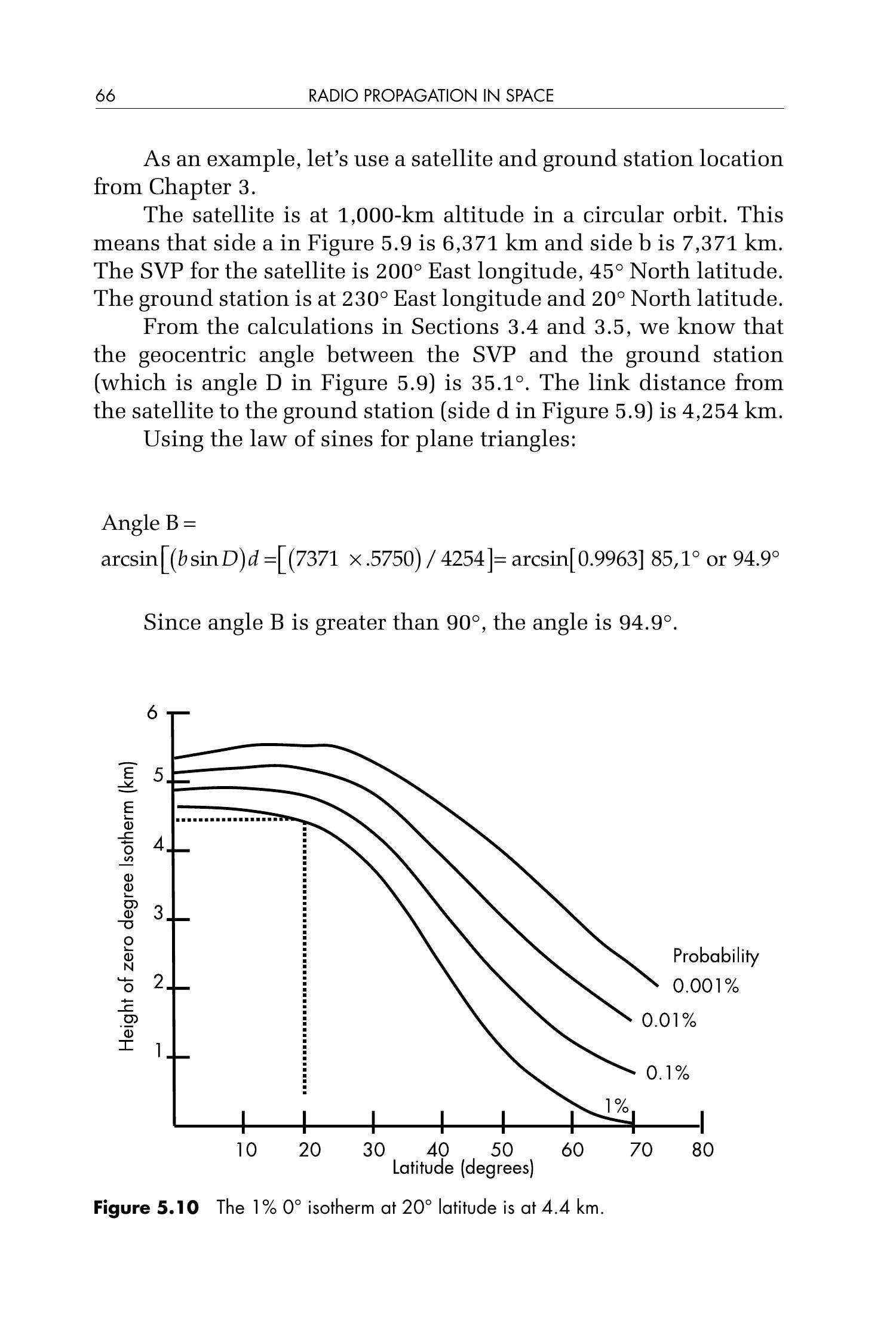 图5.10显示,在纬度 \(20^{\circ}\) 处,\(1\%\) 概率对应的 \(0^{\circ}\) 等温层高度为 \(4.4\,\mathrm{km}\)。因此,链路穿过降雨区域的距离为:
