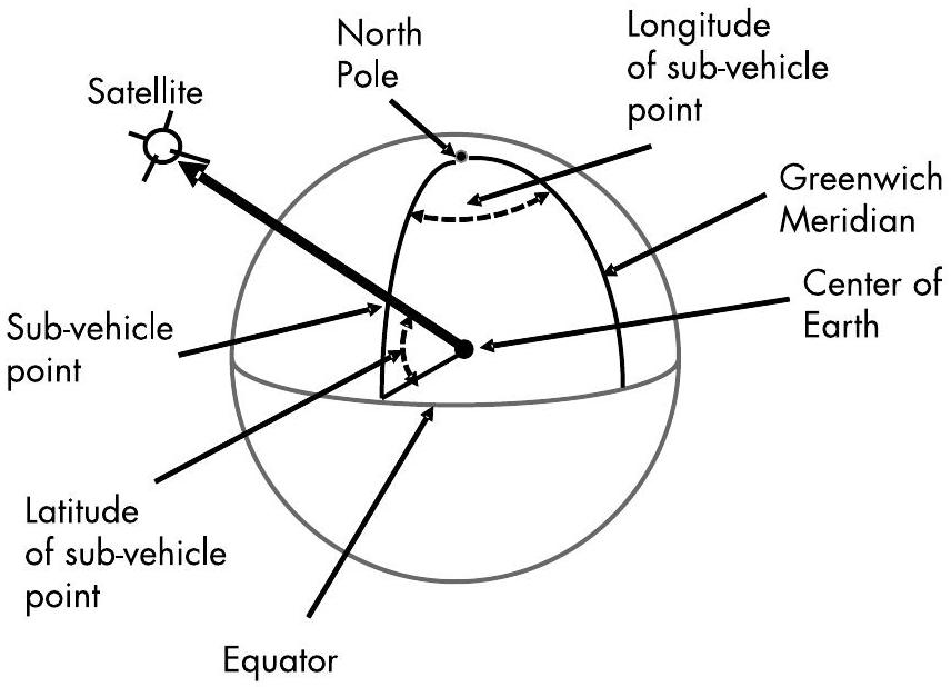 图6.1展示了卫星的星下点(SVP, Sub-Satellite Point)。如第3章所述,星下点是连接卫星与地心的直线与地球表面的交点。此处我们假设地球是一个完美球体。星下点的位置由其纬度和经度确定。回顾第3章内容,纬度是指从赤道到星下点的地心角(geocentric angle);经度是指包含北极、地心和星下点的平面与包含北极、地心和英国格林尼治(Greenwich, England)的平面之间的地心角。后者称为格林尼治子午线(Greenwich meridian)。地球上任意一点的经度均以此子午线为基准进行定义。