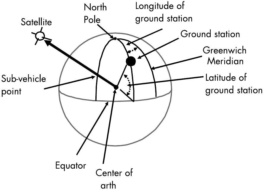 图6.2展示了地面站(ground station)的位置。此处,“地面站”指链路在地球表面的一端,它可以是卫星的地面控制站、敌方接收站或敌方发射站。上行链路(uplinks)从该地面站指向卫星,下行链路(downlinks)则从卫星指向地面站。其纬度是赤道与地面站位置之间的地心角;其经度是包含北极、地心和该地面站的平面与格林尼治子午线之间的地心角。由于经线所在的平面均通过地心,因此经线是大圆。