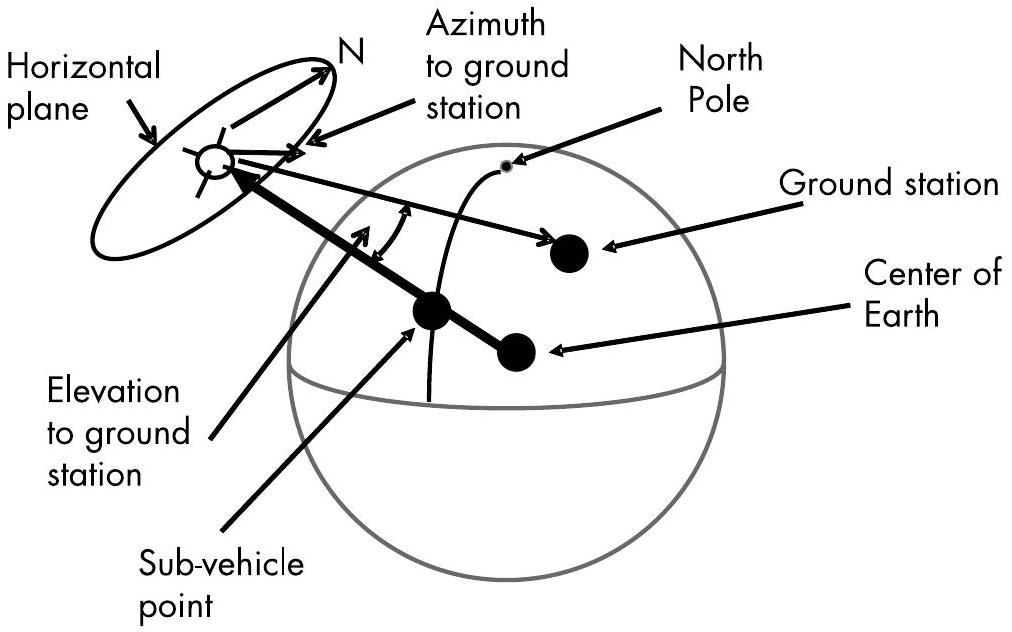 从卫星指向地面站的方向,决定了定向卫星天线为对准该地面站所需调整的指向,如图6.4所示。若讨论的是上行链路(uplinks),此天线为接收天线;若讨论的是下行链路(downlinks),则为发射天线。该天线需根据图中所示,从卫星位置对准正确的方位角(azimuth)和仰角(elevation)。此处的仰角是指从卫星视角看,地心方向与地面站方向之间的夹角。方位角则定义在一个垂直于卫星与地心连线的平面内,是该平面中从北极方向到地面站方向的夹角。