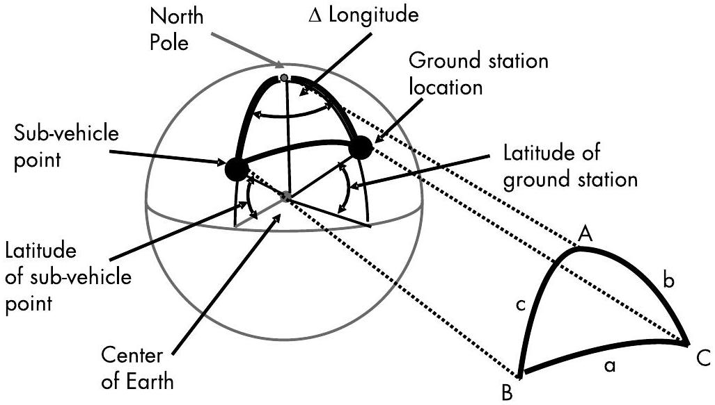 图6.5 北极点、星下点(SVP)与地面站之间构成一个球面三角形。