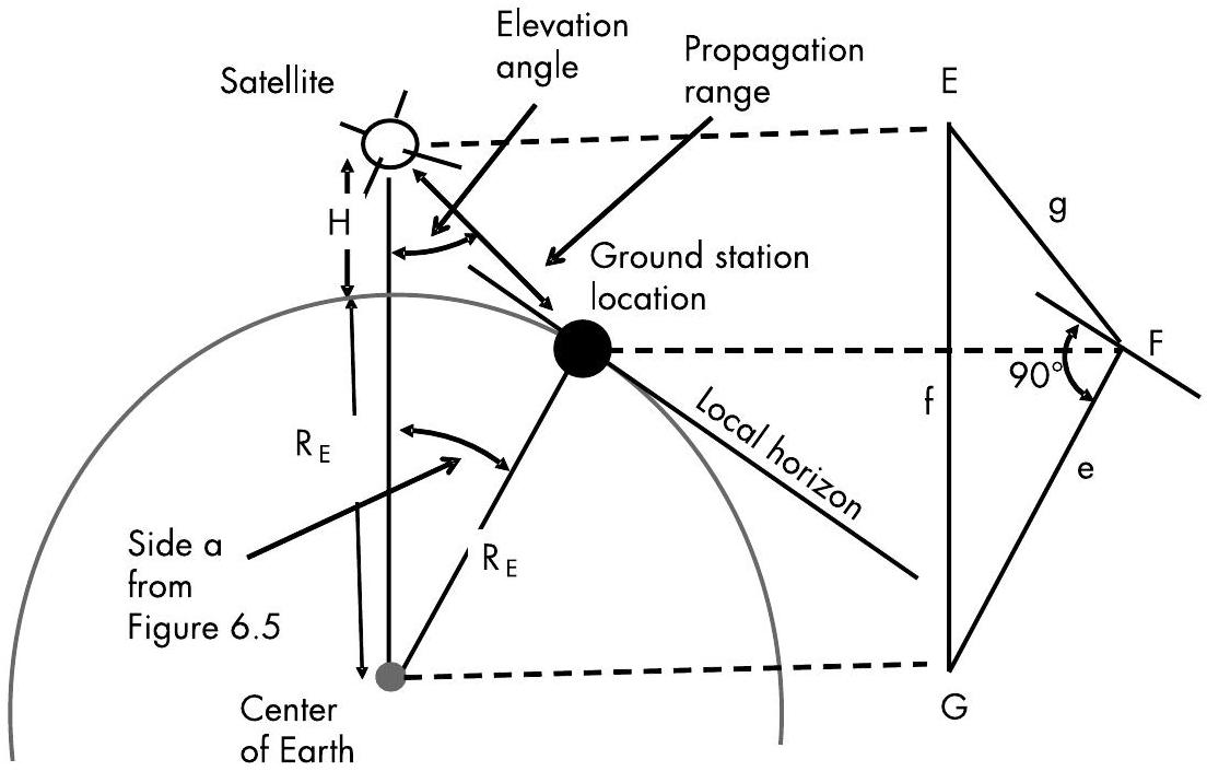 图6.6是由卫星、地面站和地心构成的一个平面三角形。为避免混淆,图中对该平面三角形的各边赋予了新的名称。 边 \(e\) 为地球半径; 边 \(f\) 为卫星高度 + 地球半径; 图6.6中的角 \(G\) 与图6.5中的边 \(a\) 相同。
