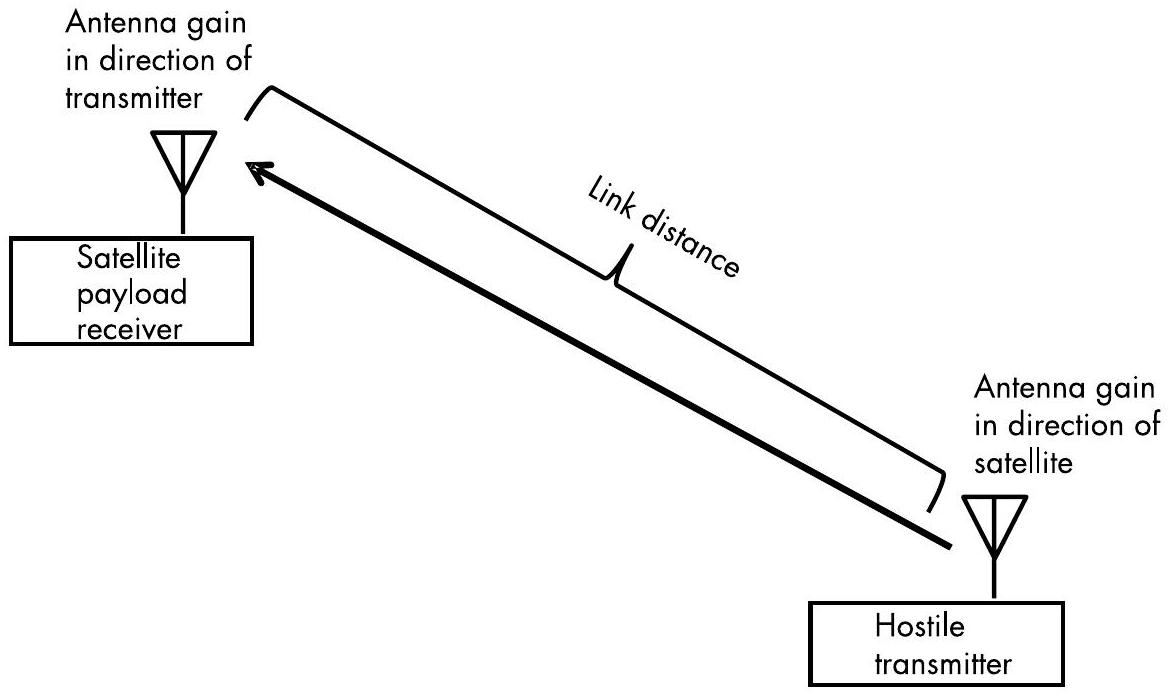 敌方发射机与卫星的位置决定了链路距离,而天线的取向则决定了有效发射与接收天线增益以及极化损耗(polarization loss)。