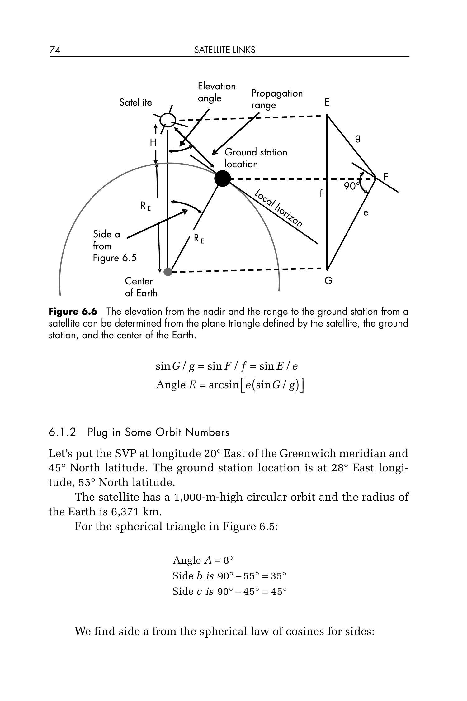 从地面站观测卫星的仰角(elevation)是指卫星相对于当地地平线(local horizon)的高度角。由图 6.6 可知,当地地平线在地面站位置处与边 \(e\) 成 \(90^{\circ}\) 角。这意味着,从地面站观测卫星的仰角等于角 \(F\) 减去 \(90^{\circ}\)。