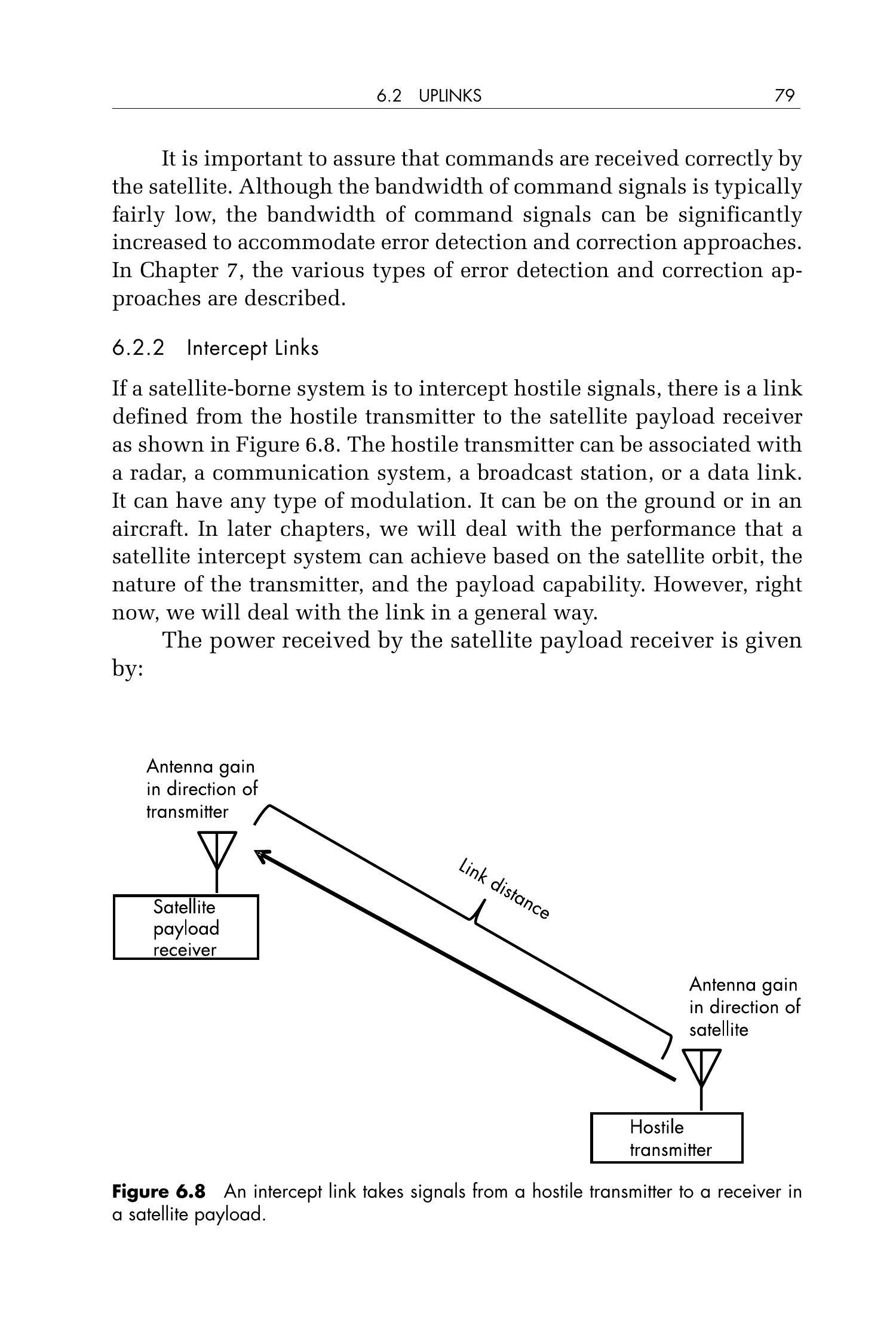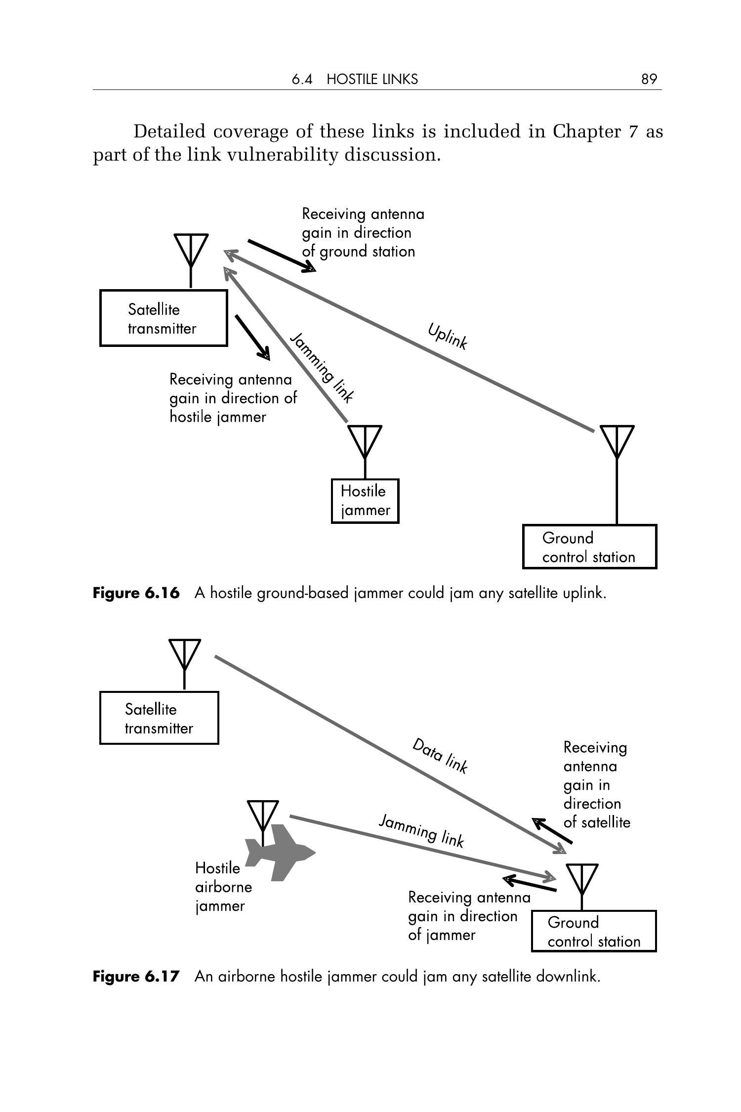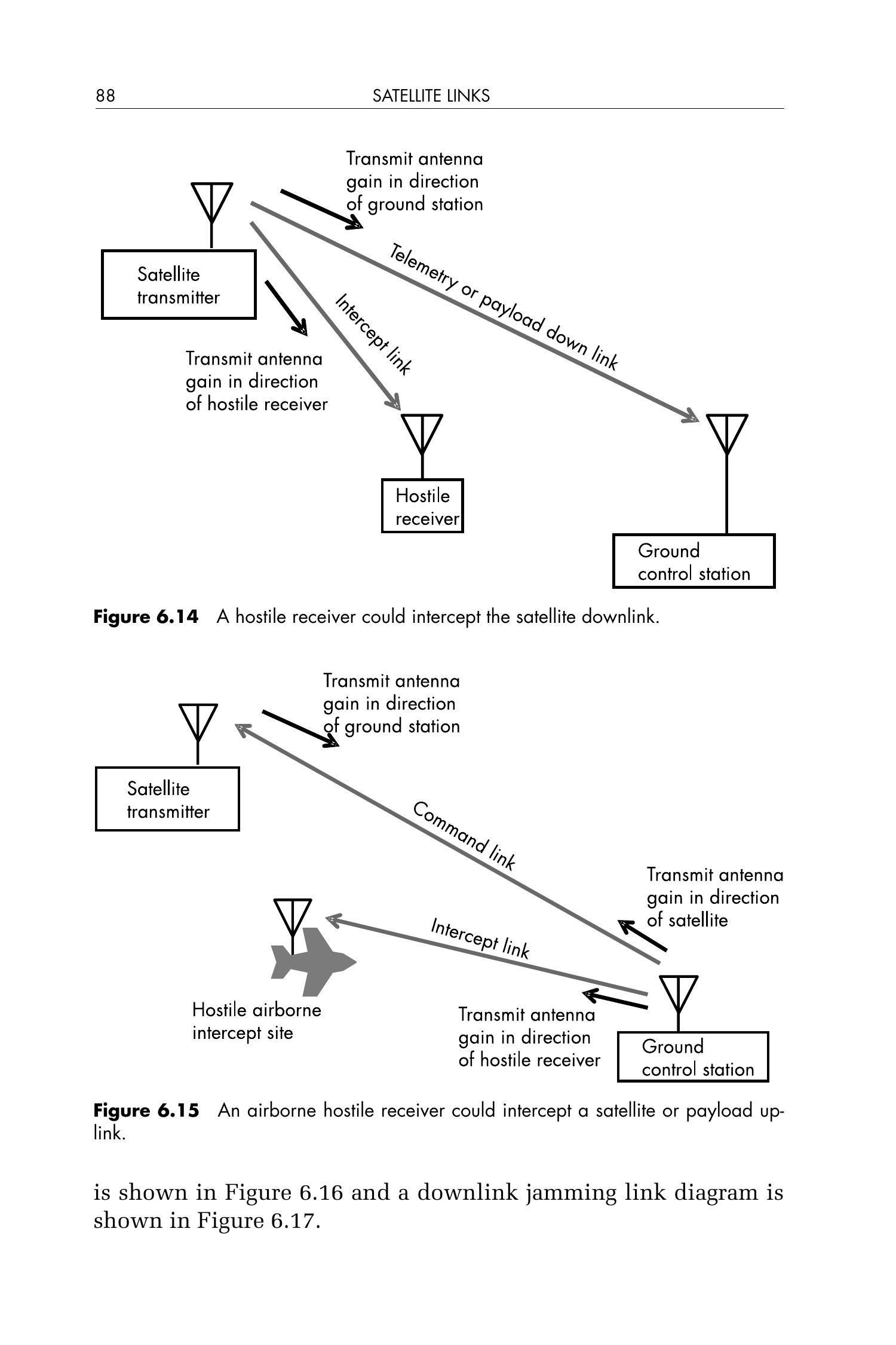 本章已描述了与卫星及其有效载荷运行相关的各类链路。此外,还存在敌方链路(hostile links)。例如,若敌方接收机用于截获卫星的任意下行链路(downlink),则其链路结构如图 6.14 所示。同样,任何指向卫星的上行链路(uplink)也可能被截获。然而,由于上行链路的发射机位于地面,除非干扰机非常靠近被干扰的地面接收站,否则此类干扰机必须部署在空中平台(airborne platforms)上。指向这些截获接收机的链路如图 6.15 所示。