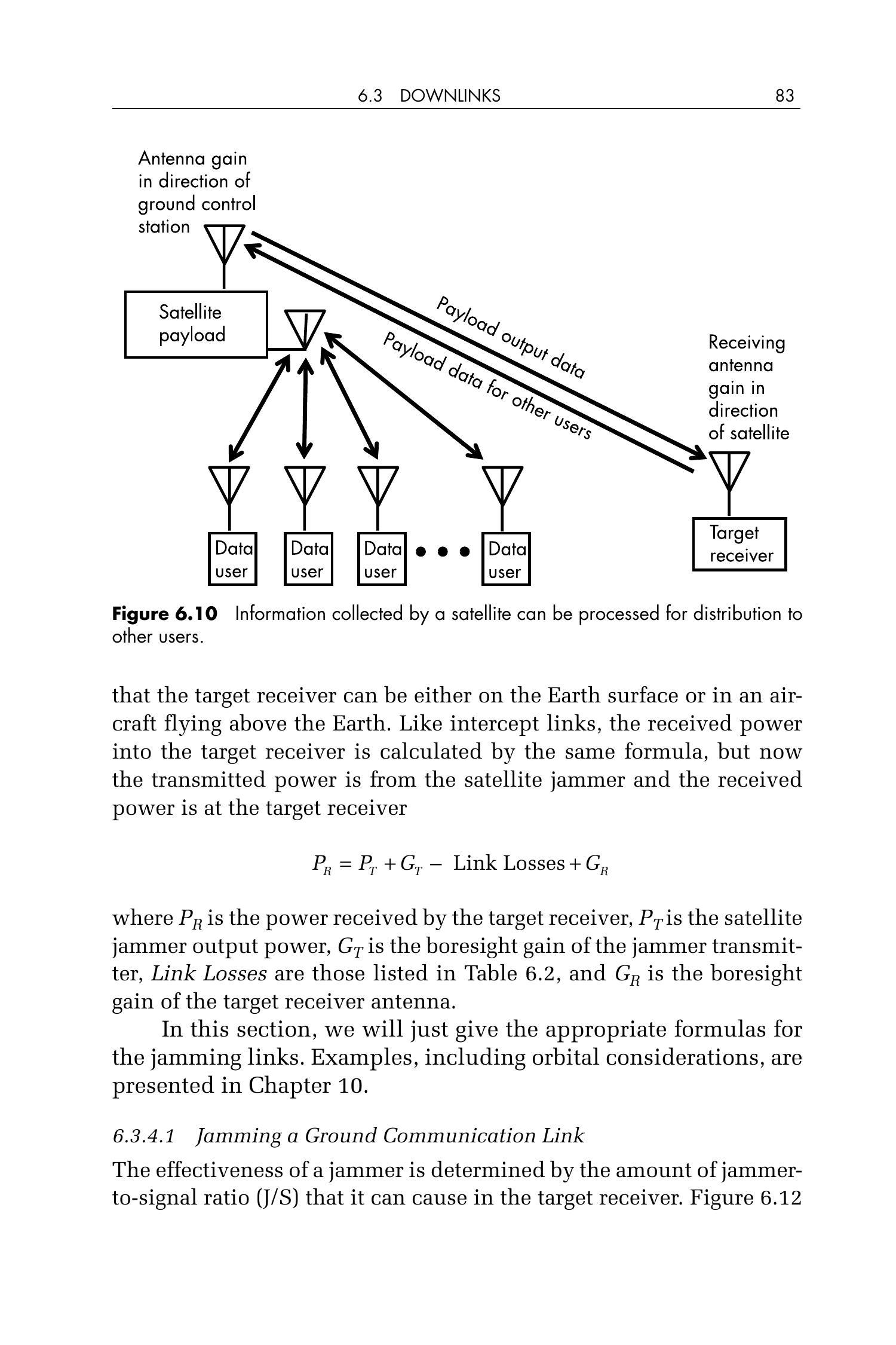 从卫星到地面的下行链路(downlinks)可指向卫星的控制站、需要接收卫星所收集信息的其他地面接收站,也可被敌方接收机截获。此外,下行链路还可能用于对敌方接收机实施卫星干扰(即从卫星向敌方接收机发射干扰信号)。图 6.9 展示了下行链路的示意图。无论何种情况,下行链路方程均为: