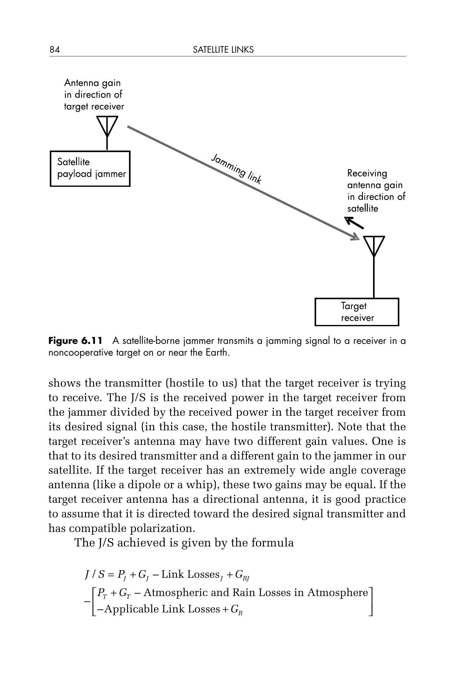 干扰机的有效性由其在目标接收机中所产生的干扰信号与期望信号功率比(J/S, jammer-to-signal ratio)决定。图 6.12 显示了目标接收机试图接收的发射机(对我方而言属于敌方)。J/S 定义为:目标接收机从干扰机接收到的功率,除以从其期望信号源(此处为敌方发射机)接收到的功率。需要注意的是,目标接收机的天线可能具有两个不同的增益值:一个指向其期望的发射机,另一个指向我方卫星中的干扰机。若目标接收机采用极宽波束覆盖天线(例如偶极子天线或鞭状天线(whip antenna)),则这两个增益可能相等。若目标接收机采用定向天线,则通常应假定其已对准期望信号发射机,并采用匹配的极化方式。
