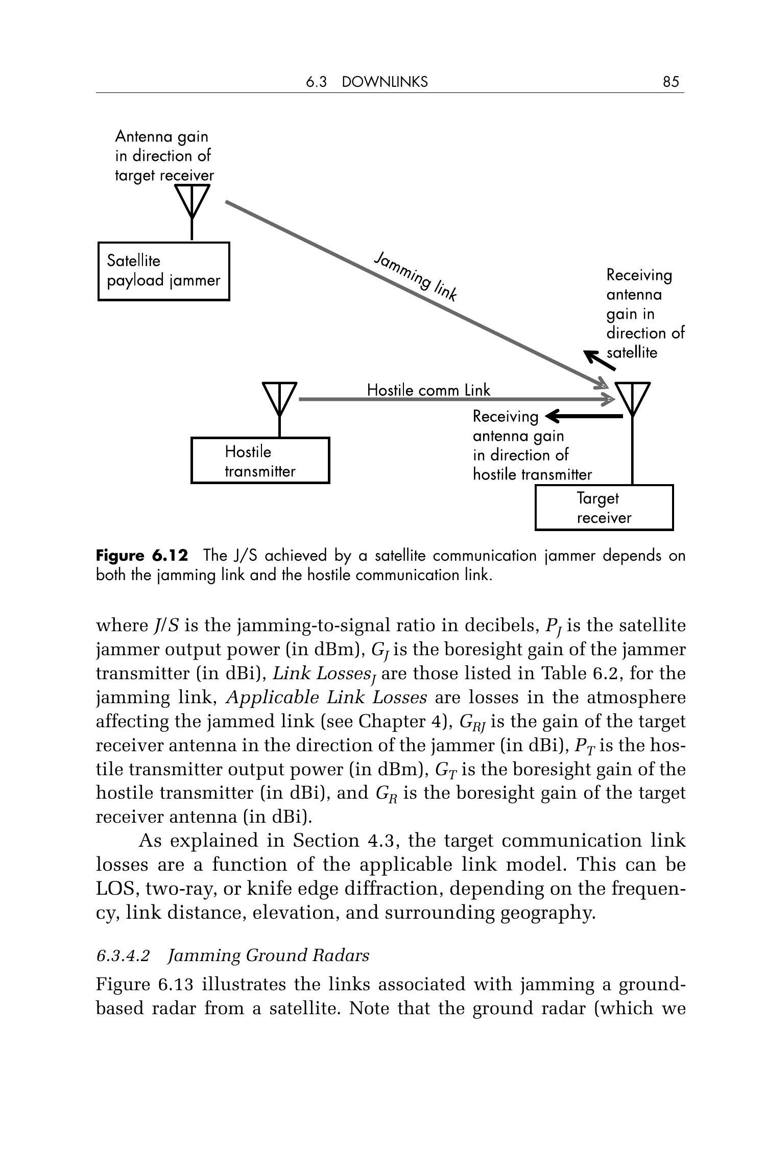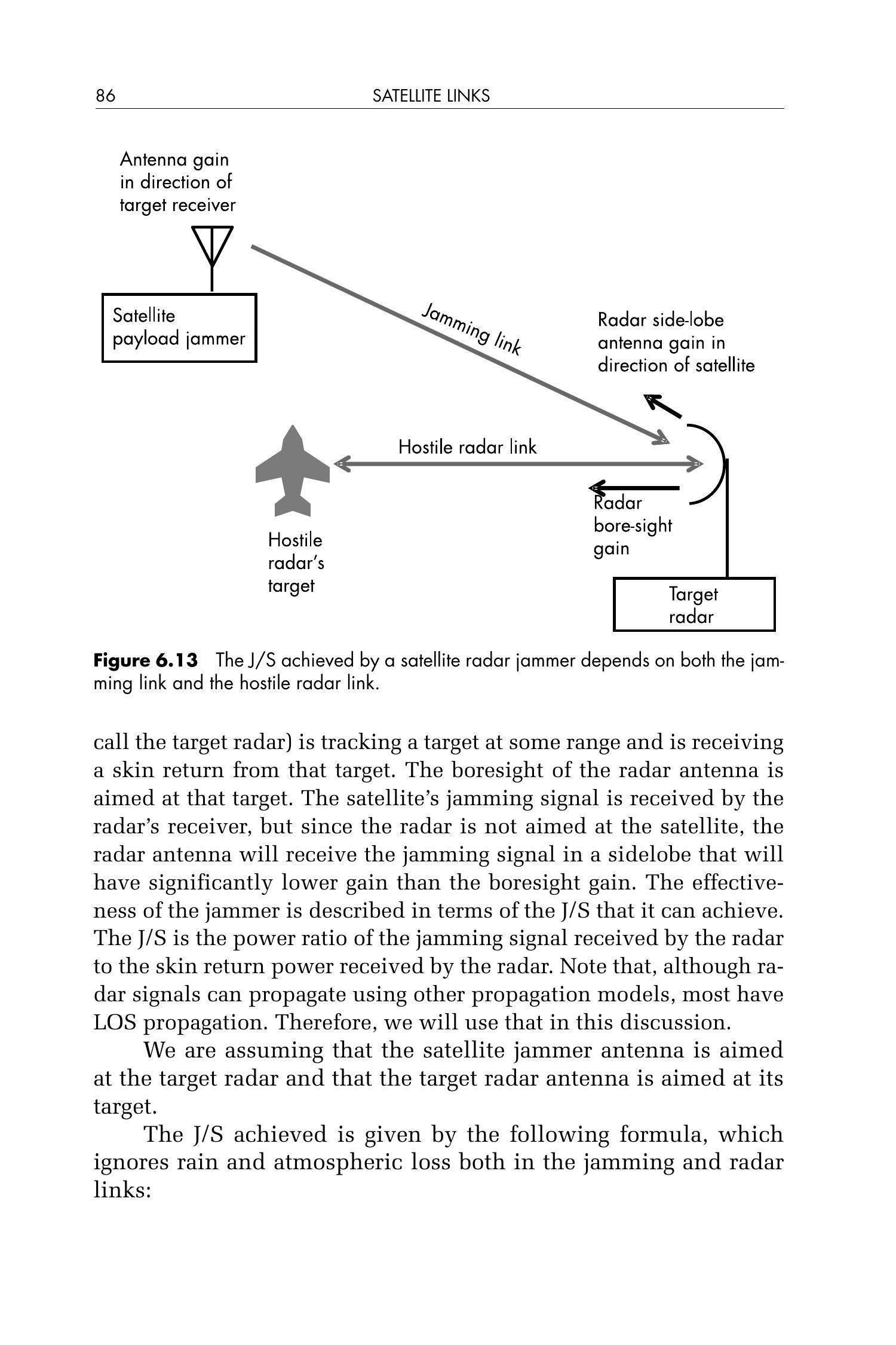 图 6.13 展示了从卫星干扰地基雷达(ground-based radar)所涉及的链路。需注意,该地基雷达(我们称之为目标雷达(target radar))正在跟踪某一距离上的目标,并接收来自该目标的镜面回波(skin return)。雷达天线的主瓣(boresight)指向该目标。卫星发射的干扰信号虽被雷达接收机接收,但由于雷达天线并未对准卫星,因此干扰信号是通过雷达天线的旁瓣(sidelobe)接收的,而旁瓣增益远低于主瓣增益。干扰机的有效性以其所能实现的干扰信号与雷达回波功率比(J/S, jammer-to-signal ratio)来衡量。此处的 J/S 定义为:雷达接收到的干扰信号功率与接收到的目标镜面回波功率之比。需要注意的是,尽管雷达信号可能采用其他传播模型,但大多数雷达采用视距(LOS, Line-of-Sight)传播方式。因此,本讨论中采用 LOS 模型。