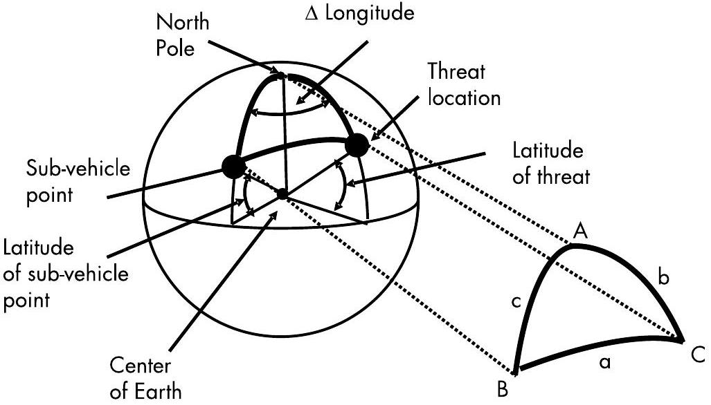 图 9.2 卫星视角下,从天顶点起算的仰角和与地面威胁的距离,可由卫星、威胁目标和地心构成的平面三角形计算得出。